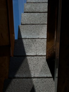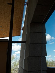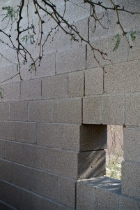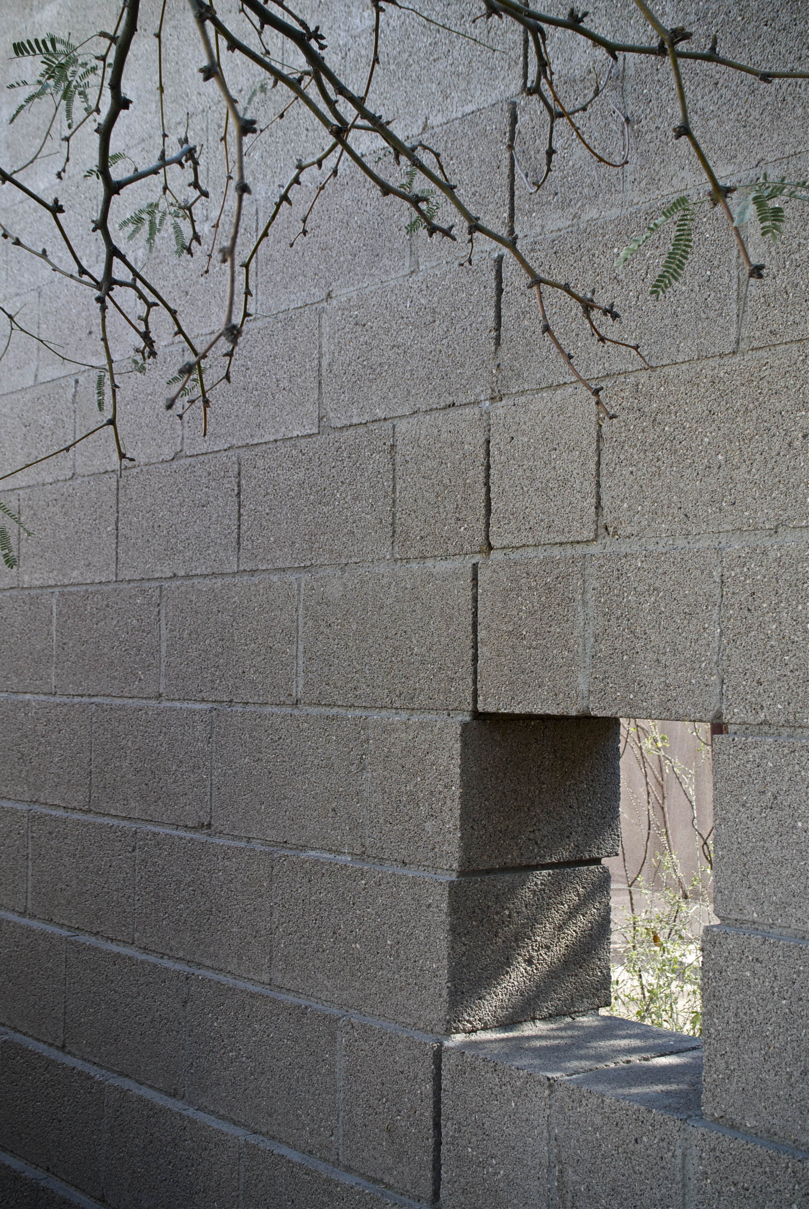 A spring afternoon image of another perfectly-placed “void” found in the auto court/entry, (below). The Mesquite tree creates a living canopy above the front door and the soft, even lighting invites the viewer to study the texture and color of the CMU wall offering a hint of the effect that sunlight has when it beams down directly onto the horizontal edge of each course of block.