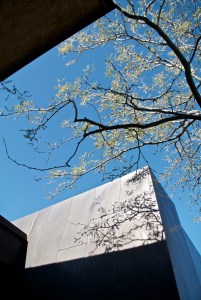 Copper-clad walls angle up and away from the viewer in the adjacent image, (below), framing branches of the mesquite tree at the entry off the auto court.