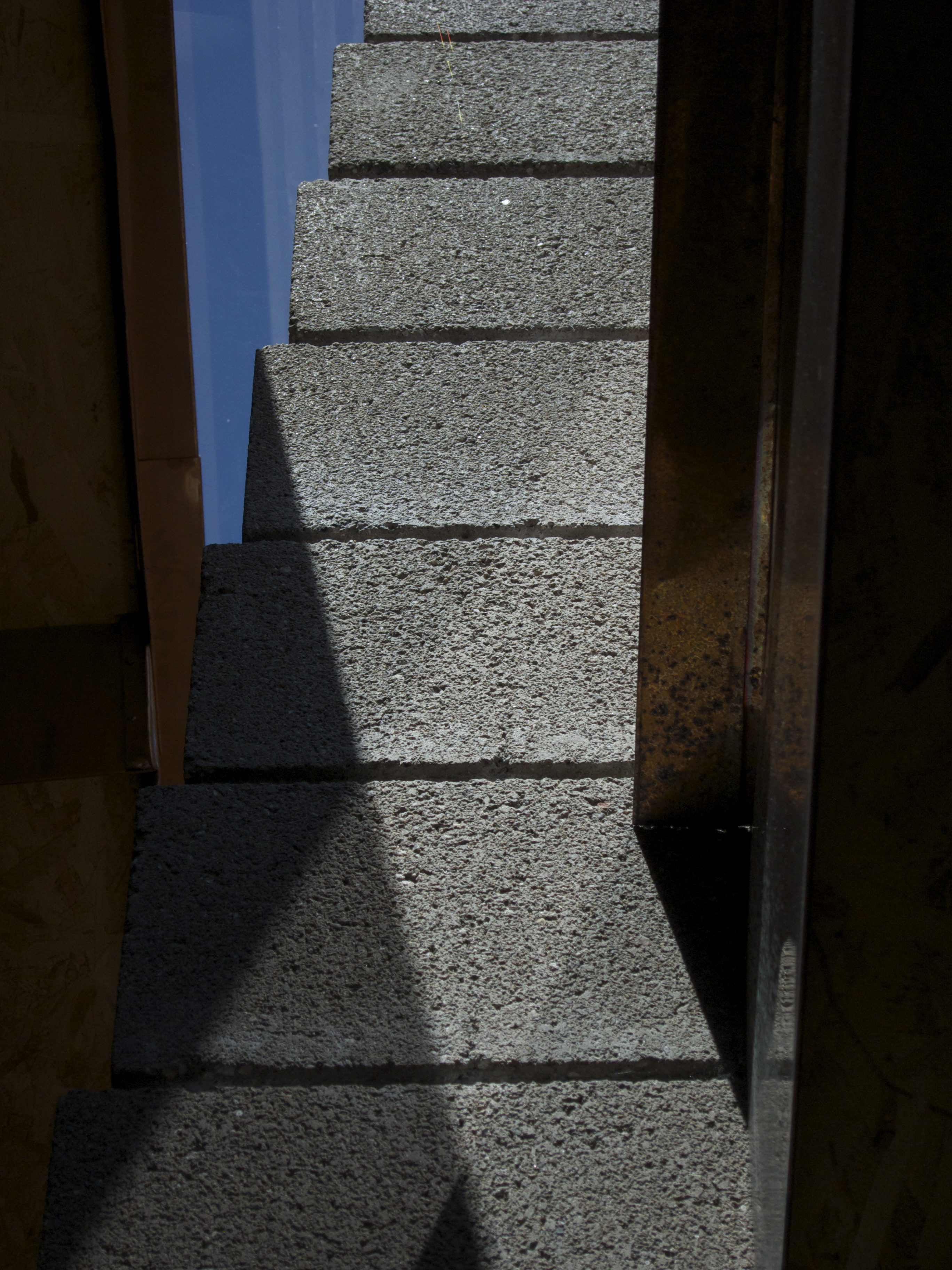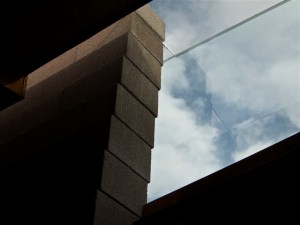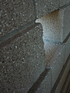 A close up view of the Gallery wall, (above), with one of the carefully-placed openings, (or “voids”), in the CMU wall. This shot also illustrates the clever approach employed by the masons to emphasize the “stratum” represented by the wall when they recessed the horizontal mortar joint between every course, and filled the vertical joints such that they are flush with the face of the adjacent blocks. I remember being struck by this remarkable detail when Bill pointed it out while we were walking through the home during our first visit.