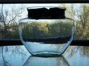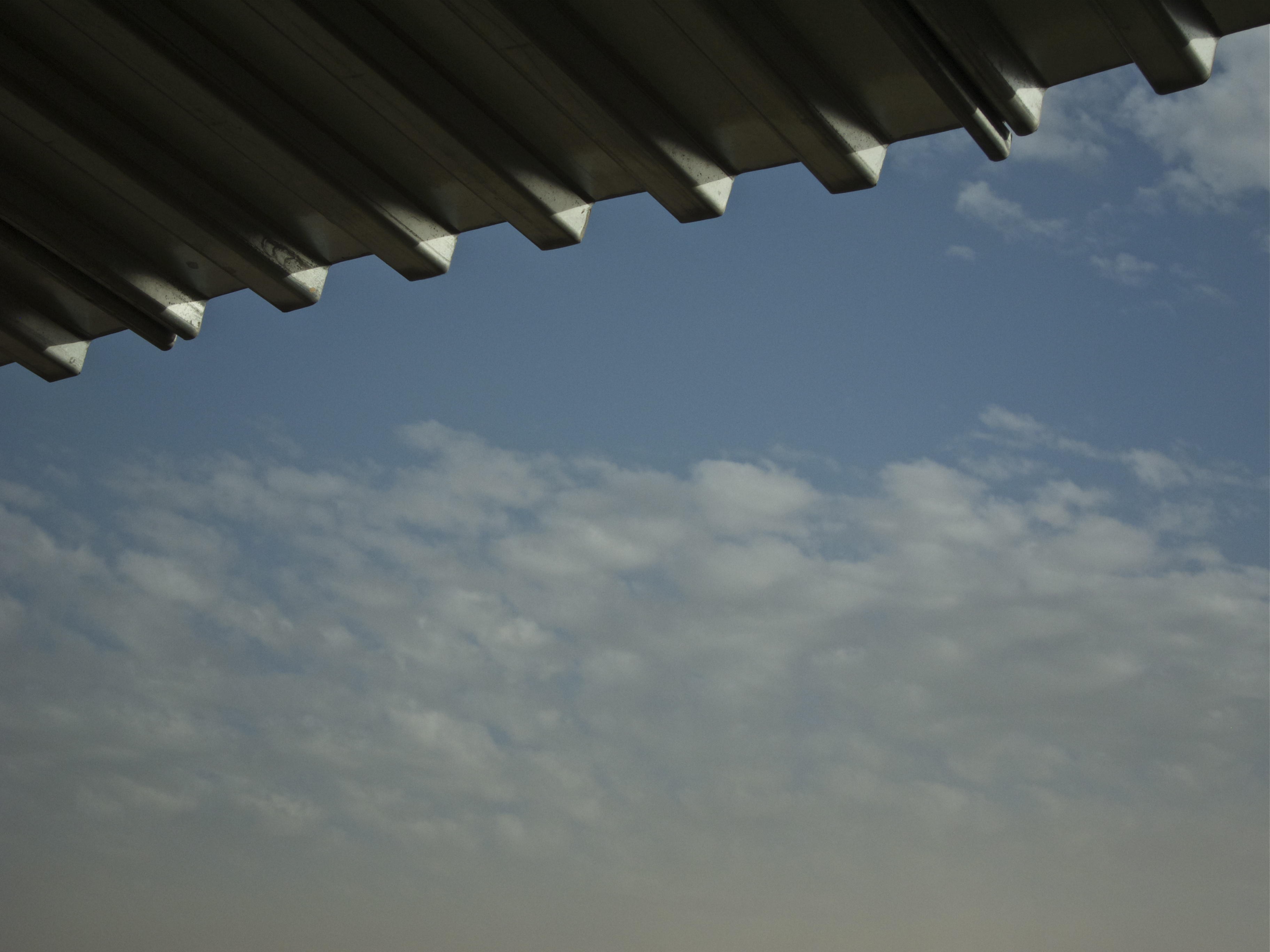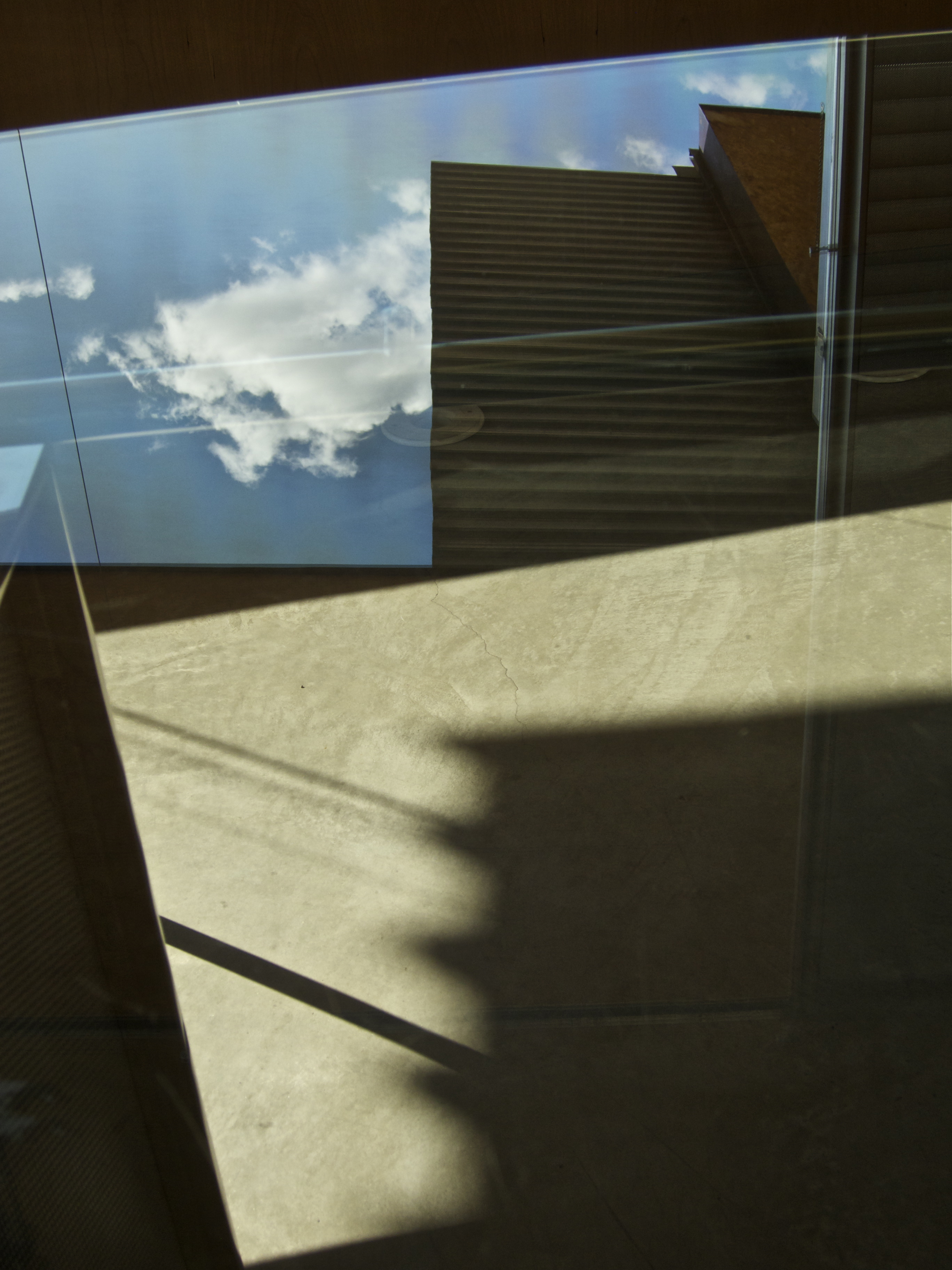 Reflections of clouds, the sky and the roof overhead captured on the surface of the Dining Room table, (below). A corner of the stainless steel table base can be seen in the lower left-hand side of the image, and one of the legs of a kitchen chair is faintly visible in the upper right-hand corner beneath the glass table top. I really enjoy the subtle patterns in the surface of the concrete floors – they are almost cloud-like in their appearance, adding to the dreamy feel of the photograph.