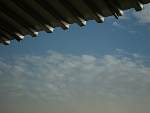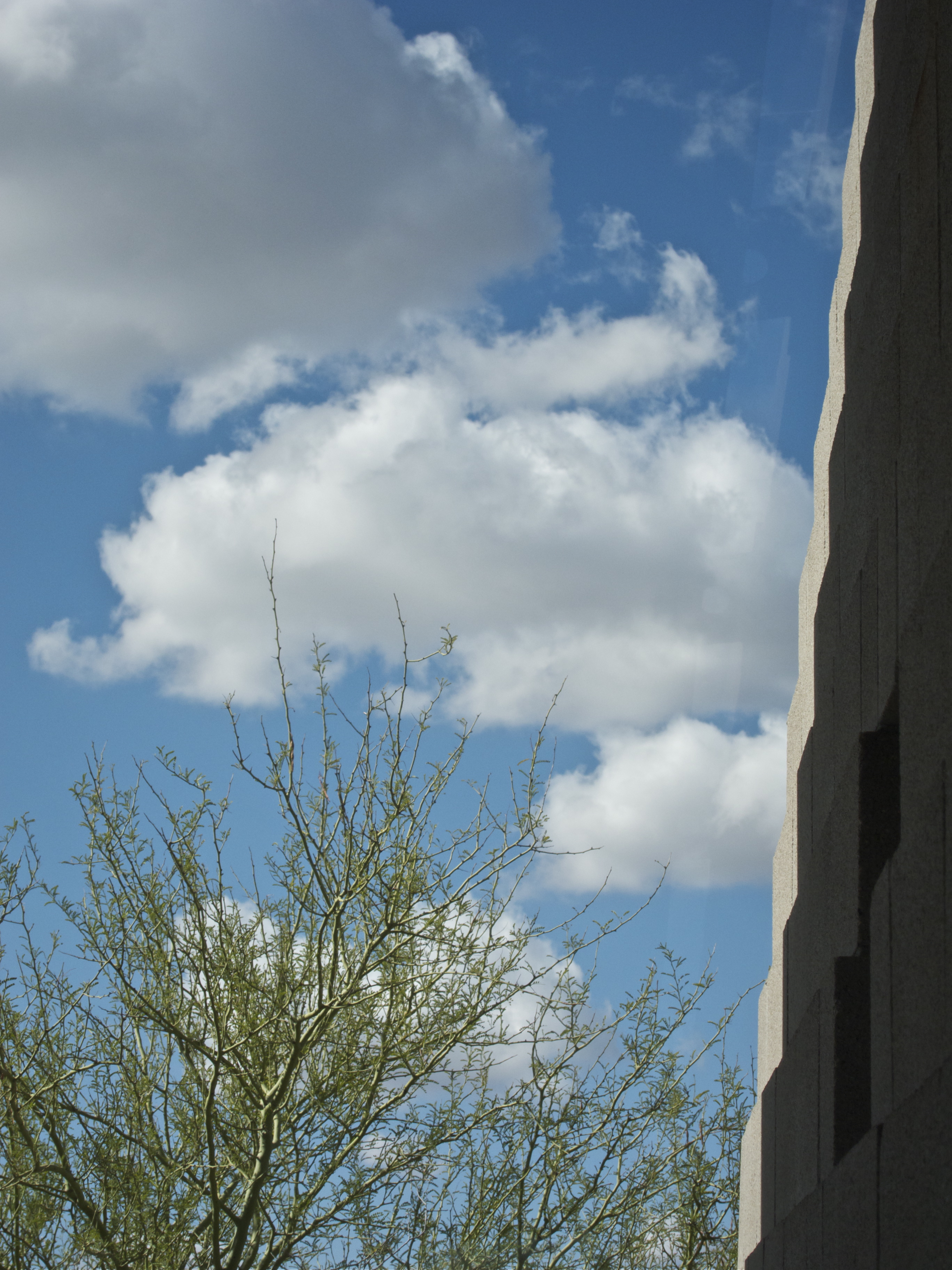 This photograph, (below), captures the view to the west including another “void” in the CMU wall above the barbecue, as well as the interplay of light and shadow at the very edge of the wall. The vivid greens of the Palo Verde tree and the vivid blues and whites in sky and clouds beyond add visual interest to the image.