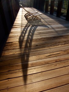 The east deck, (above), located just off the Master Bedroom, is an ideal location to spot wildlife, particularly in the early morning. The long shadows appear just after sunrise and stretch westward toward the house. The redwood deck is developing a wonderful patina – as the wood continues to darken and take on various shades of silver and gray, it provides a rather appealing contrast both in terms of color – and texture – to the oxidized steel screens and railing forming the perimeter of the deck.
