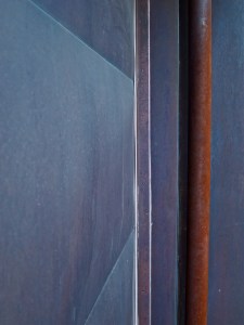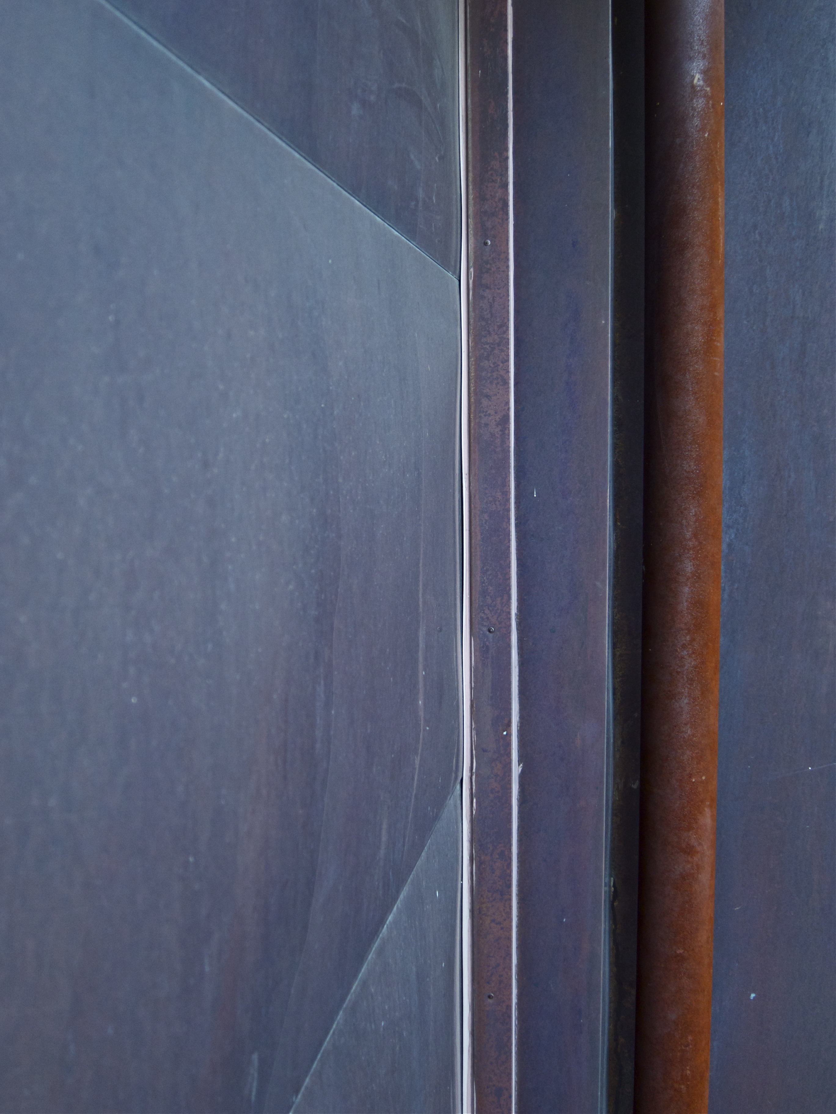 A close-up of one of the oxidized steel poles against the blue-blackened copper cladding that wraps around the east side of the house, including the garage, (below). This photograph was taken while standing about six inches away from the front of the garage looking to the right, (north), toward the corner.
