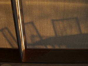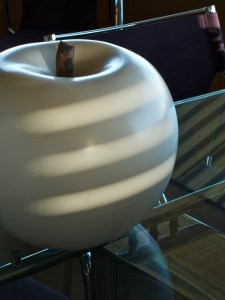 The interplay of light and shadow, seen from outside, (below,top), looking up toward the Dining Room windows, and then standing in the Dining Room, looking down at the stainless steel table base, (below, bottom), with a playful piece of ceramic sculpture sitting on the glass table top.