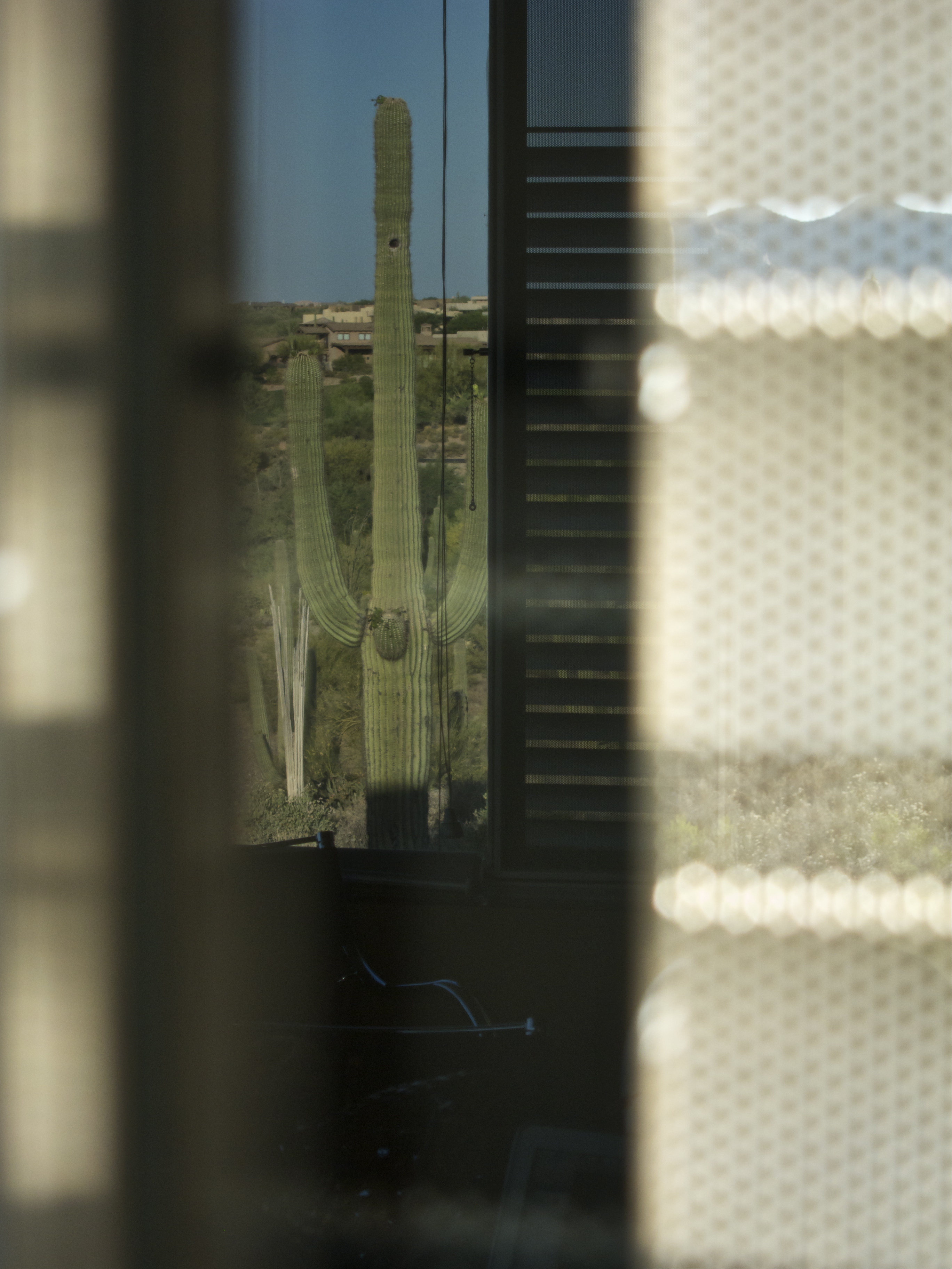 Carol’s expertise with color and texture led to perfect choices for the interior walls requiring paint. In fact in this photograph, (below), you can see the inspiration for the lovely shade of green used on the east wall of the Kitchen and Dining Room. If you gaze out into the desert, you spot a magnificent saguaro off in the distance, the very source of the particular shade Carol selected.