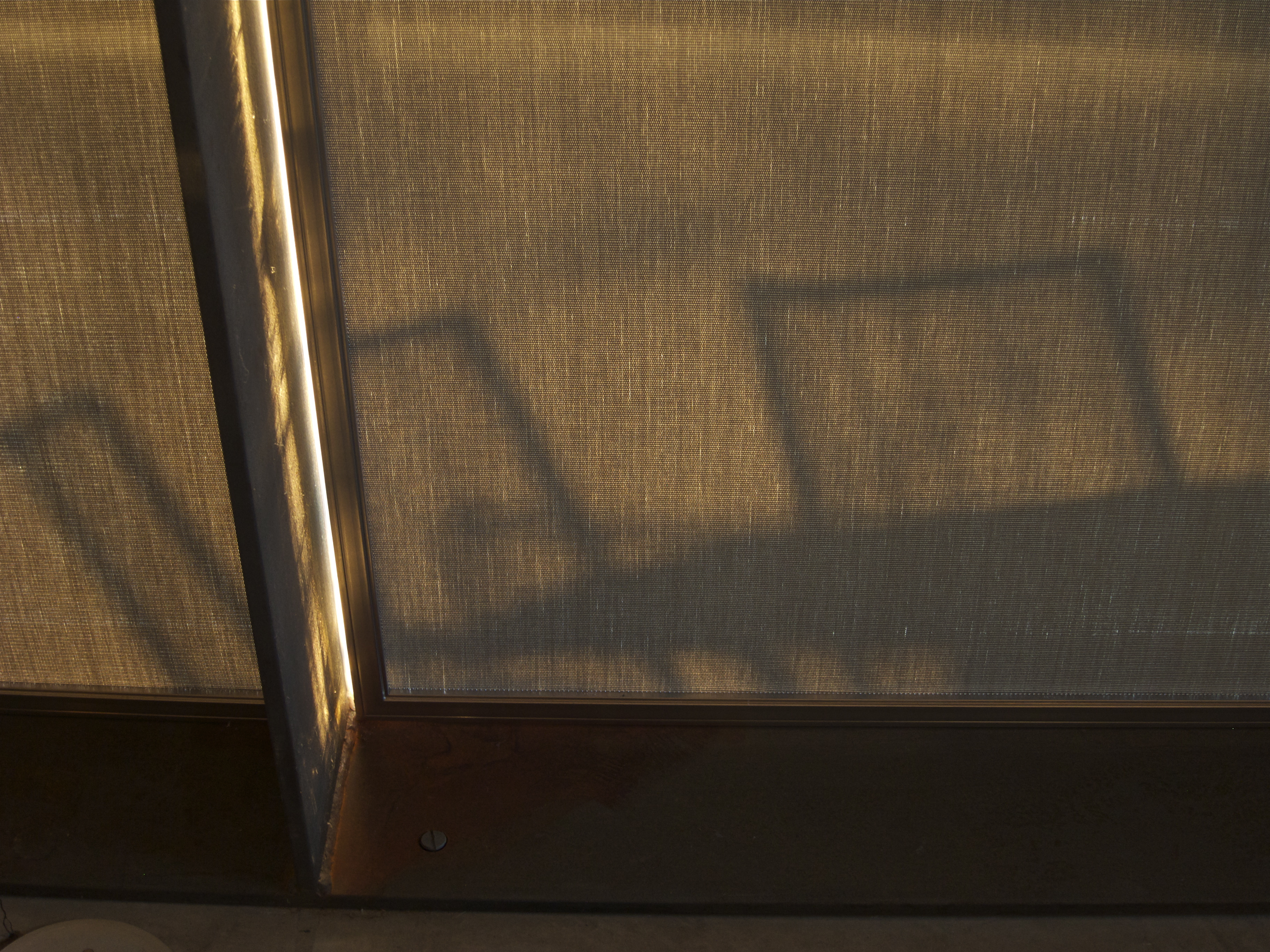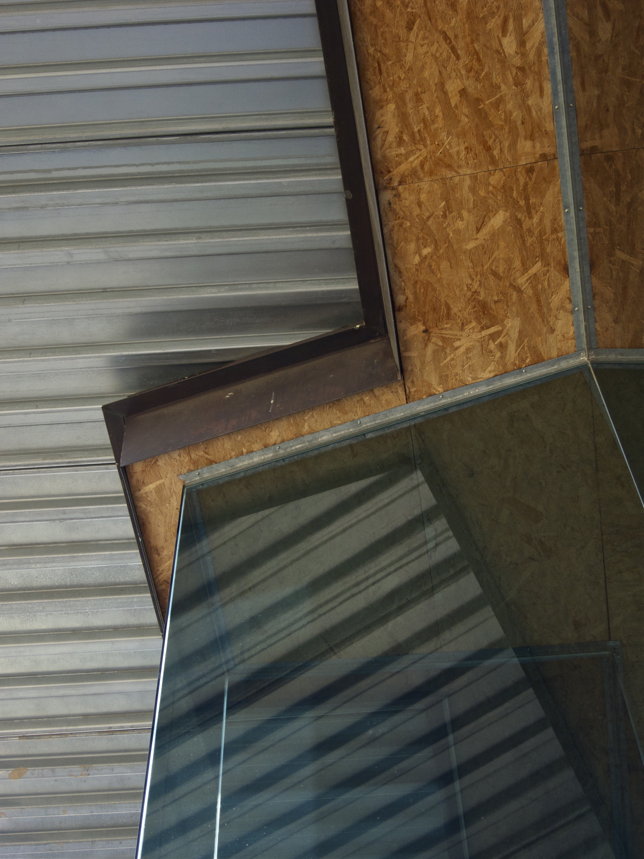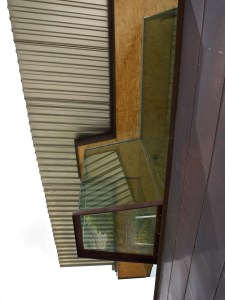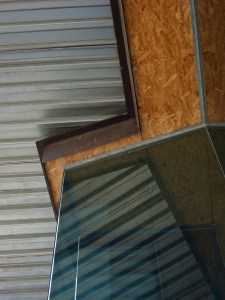 This photograph, (below), highlights the steel brackets supporting the roof canopy, the delicate steel trim bracketing the door leading to the patio, the surrounding green “solex” glass panels and the largest “void” found along the entire length of the Gallery wall. The reflected light in this image washes the OSB sheathing on the underside of the roof canopy, so the viewer can truly appreciate the suede-like texture created by sandblasting the surface of each OSB panel.