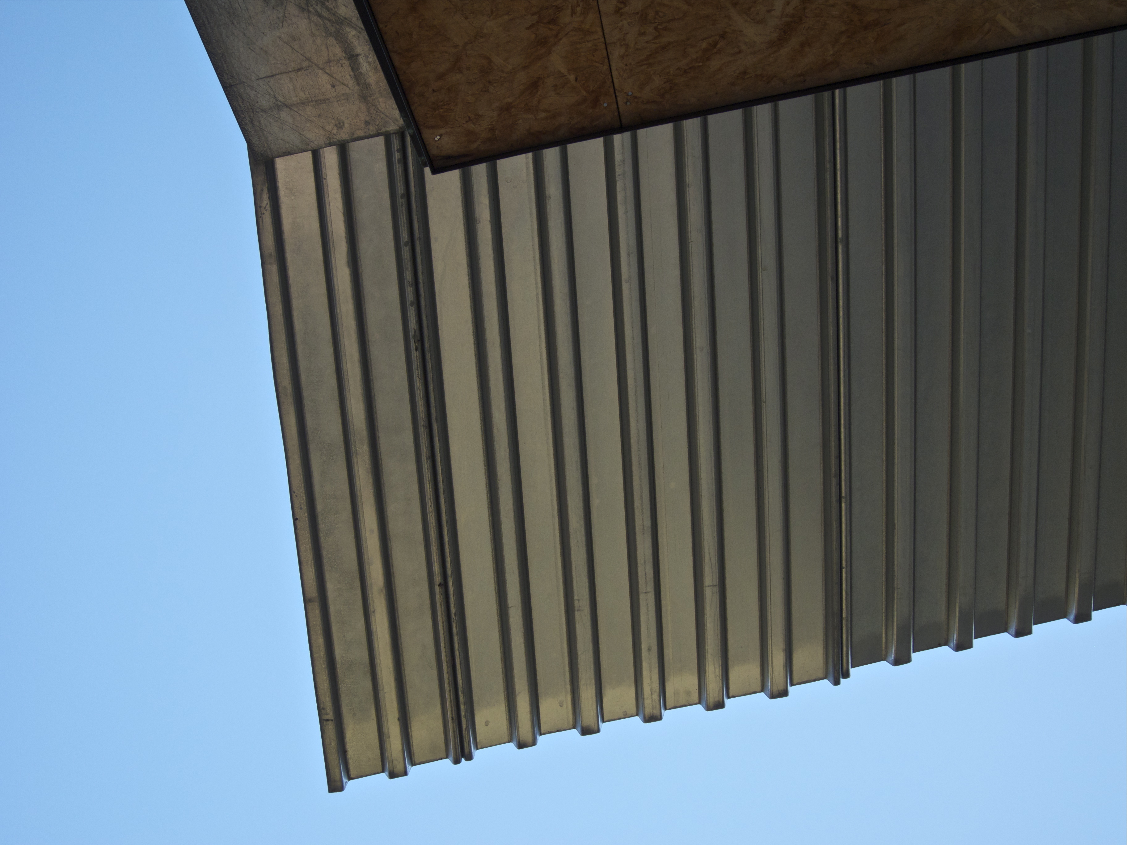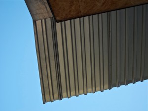 View looking straight up from lower-level patio toward sandblasted oriented strand board, (OSB), sheathing on underside of the roof canopy and the galvanized corrugated metal panels used on the roof, (below). The wide drip ledge is an absolute necessity!