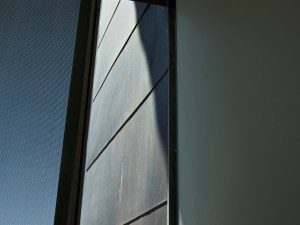 Again, simple transitions from material to material and from inside to outside. This is the view through the window in the master bathroom out to the copper-clad frame wall on the east side of the dining room, (below).