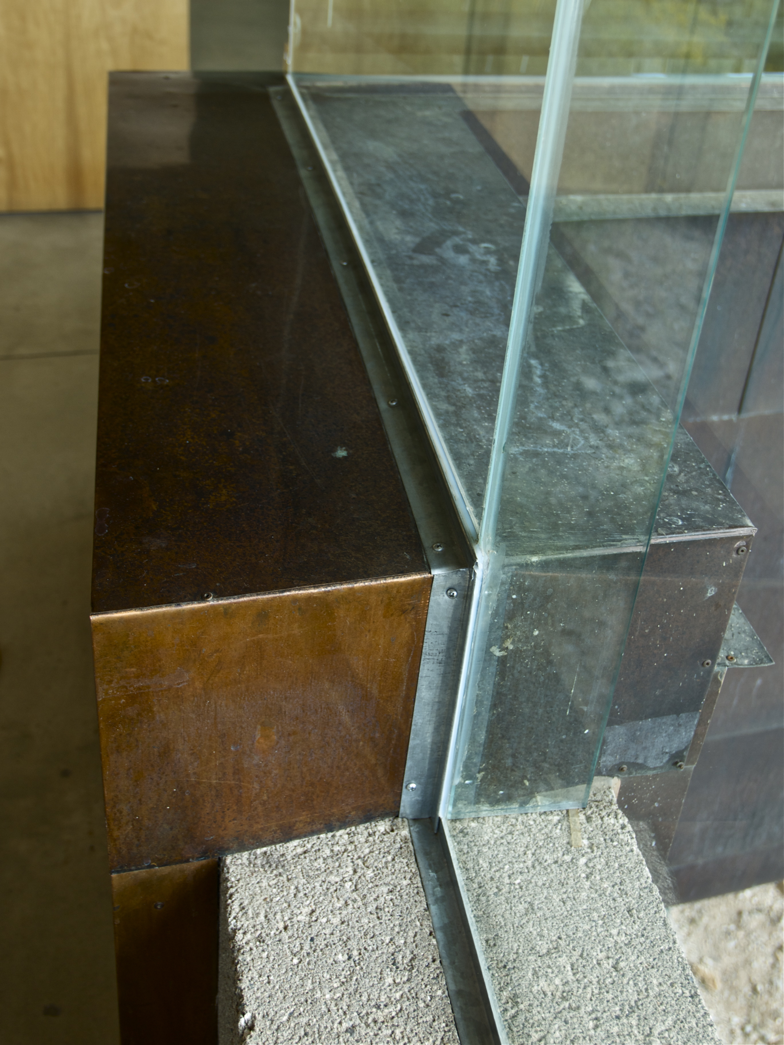 The transition from concrete masonry unit, (CMU), wall to copper-clad wall that borders dining area, (below). Notice the simplicity of the seams where different materials meet – CMU to copper, copper to glass, glass to glass and glass to CMU. It really does make it possible to appreciate the craftsmanship!