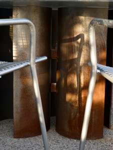 Wonderful shadows cast on the steel base supporting the table on the west patio as the sun is setting. Three partially-formed steel cylinders, joined together with a clever steel coupling in the center, supporting a custom cast acrylic table top, (below).