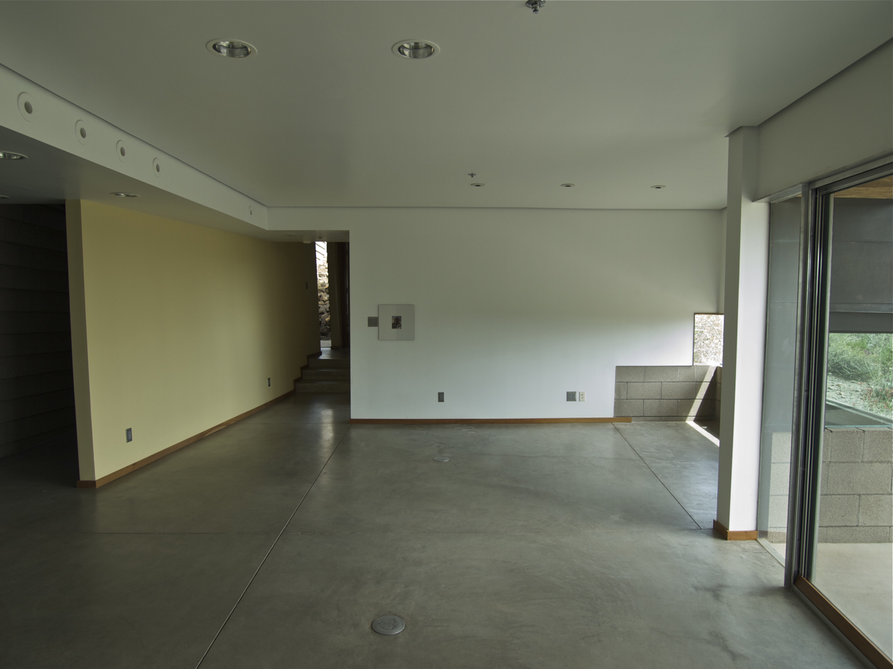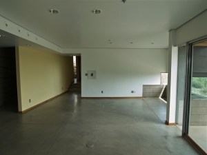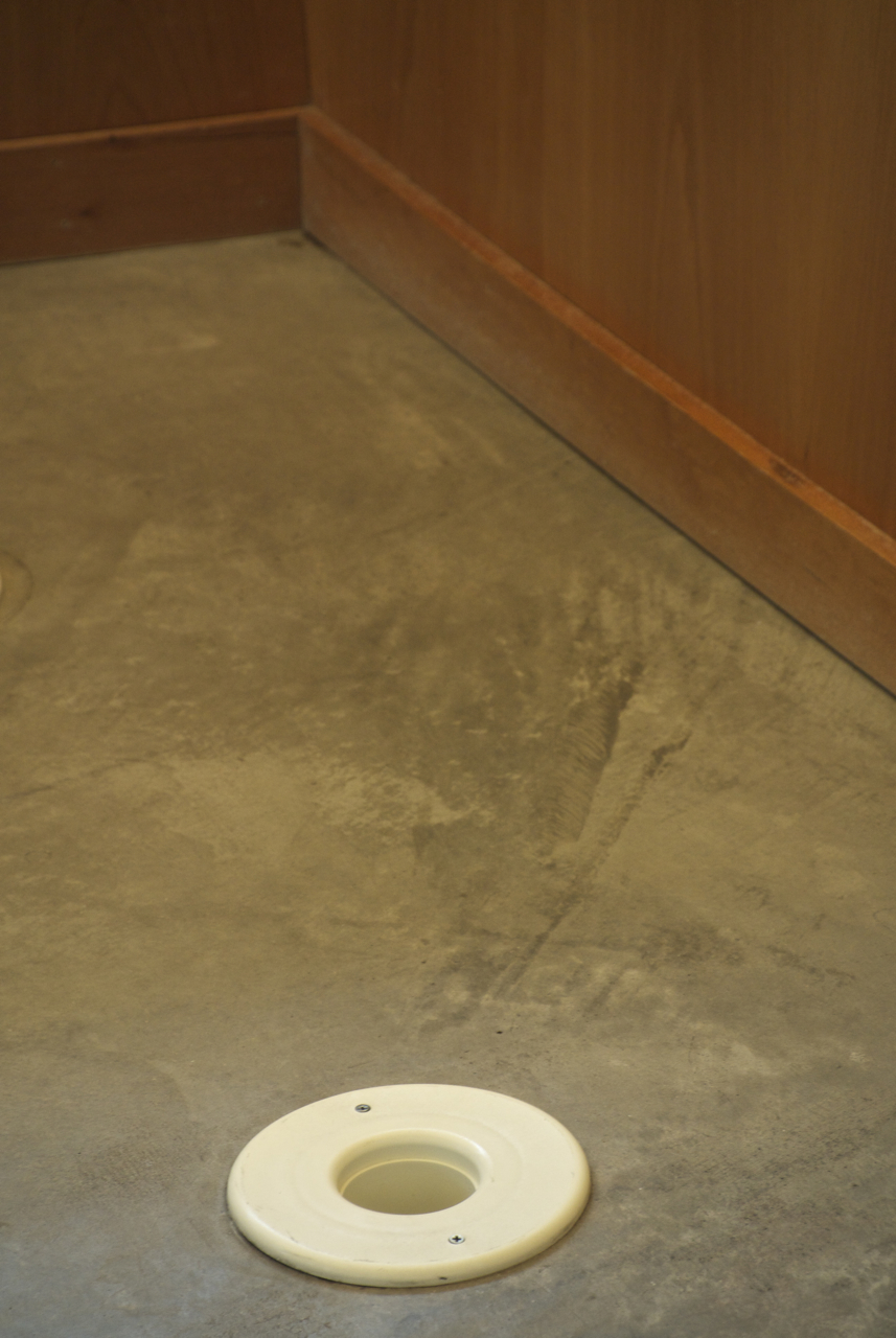 I mentioned the outlets mounted in the floor in the Living Room and Kitchen… I’ve inserted two photographs, (below), the first was taken with a slight perspective so you can see how the outlets are placed along the perimeter of the room, while the second is a close-up showing how the outlets are attached to the concrete floor.