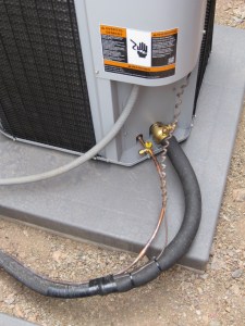 …and a close-up, (below), of the connections to one of the units, (electricity, high pressure, low pressure and thermostat). You can also see an example of the new pads we requested for each unit. The original pads were concrete, while these new ones are made out of plastic! We used the original pads to establish a level foundation on top of the decomposed granite we spread around inside the enclosure, then we placed the new pads on top of the concrete pads to elevate each heat pump about 2 inches above grade. I thought the plastic would isolate the vibrations coming from the heat pump units themselves, (slightly), and also keep rain water from pooling beneath each unit.