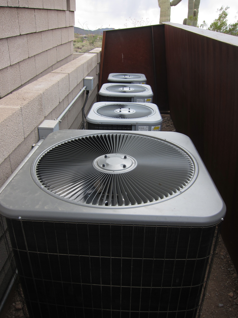 A quick look at where the four heat pumps are located on the north side of the house in a specially-designed A/C enclosure, (below).