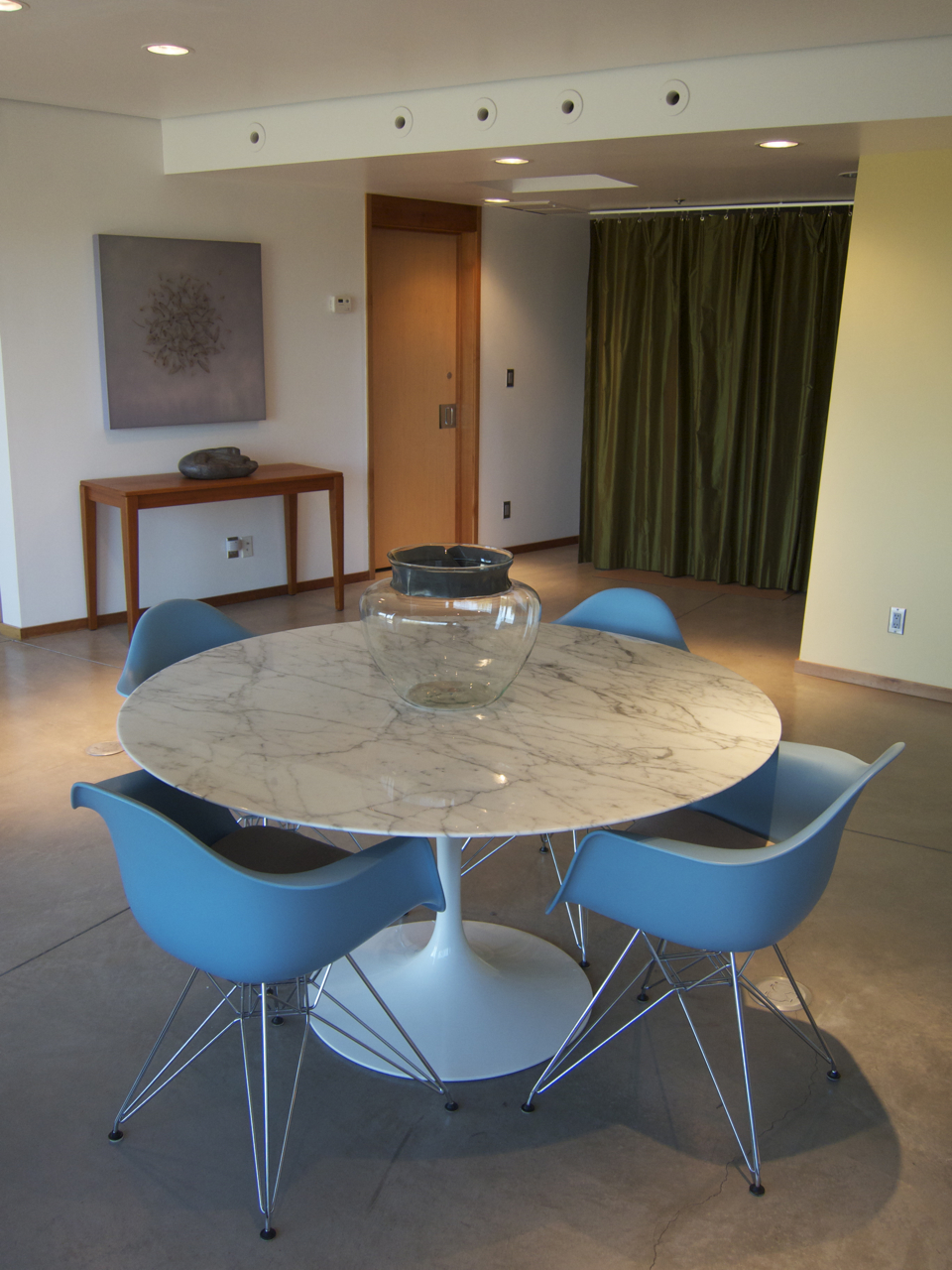 The next image, (below), is of the lower-level Living Room taken earlier this spring. Martha was standing in the southeast corner of the room, looking back to the northwest corner, when she took the photograph. Again the outlets are visible toward the top of the image. The sculpture on the table over against the wall is by Steve Kestrel and the mixed media piece hung on the wall immediately above it is by Mayme Kratz.