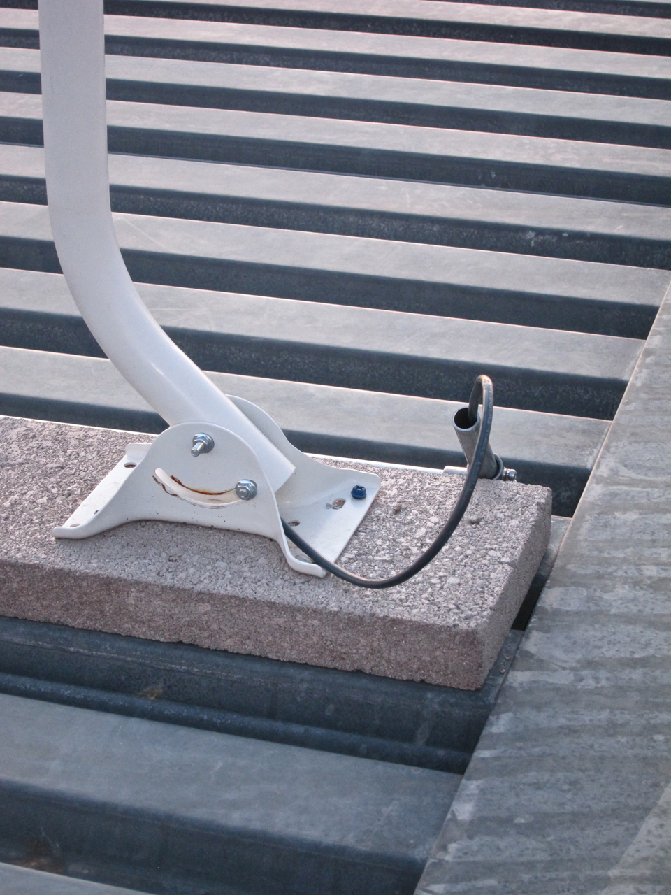 The next two photographs illustrate where the twisted pair cable exits the mast below the radio and enters the conduit, as well as the twisted pair exiting the conduit at the other end, then looping up and over into the range hood exhaust vent opening cut into the roof, where the twisted pair cable drops down into the crawl space immediately above the Pantry. Note the simple “ballast” used to steady the mast without being attached to the roof! It’s a solid piece of cast concrete weighing more than enough to keep the radio and mast from being blown over in heavy winds. I can certainly attest to how effective the ballast is too – wind gusts of 40, 50, even 60 miles an hour are routinely experienced at the Byrne residence.