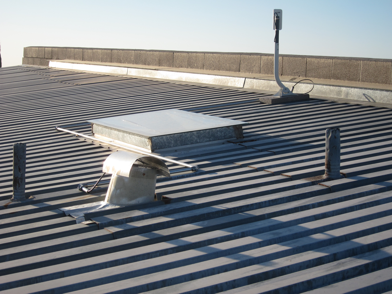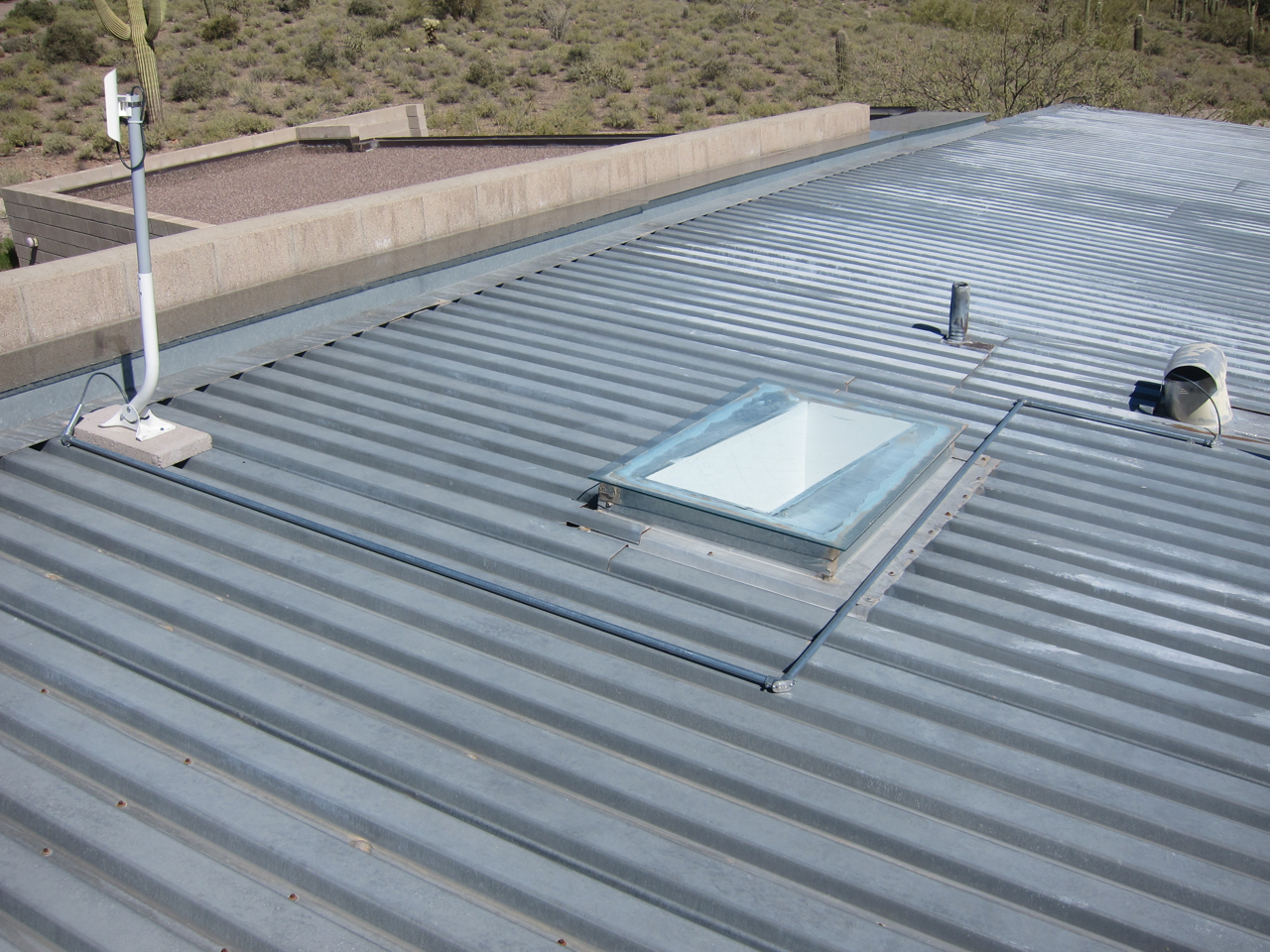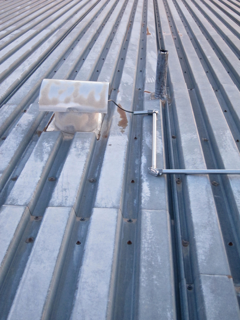 This second pair of photographs, (below), depict the final installation on the roof of the Byrne residence. The observant reader might detect a slight difference between the upper image and the lower image – it’s the length of the PVC mast, (I chose to shorten the PVC mast to make the radio less apparent from the street, hence the difference). I routed the galvanized metal conduit down along the raised rib of one of the corrugated steel panels on the roof just to the left of the radio mast, made a 90 degree bend immediately beneath the skylight, used another piece of conduit to route the twisted pair cable over to the raised rib just to the left of the range hood exhaust vent, with a final 90 degree bend and 4 inch segment terminating next to the vent itself. Any rainwater that happens to find the open end of the conduit right below the mast will drain out the other end of the conduit due to the slope of the roof, (north to south and west to east), and the slight downward tilt of that final piece of conduit just to the left of the range hood exhaust vent.