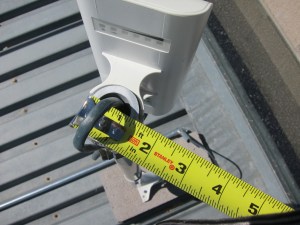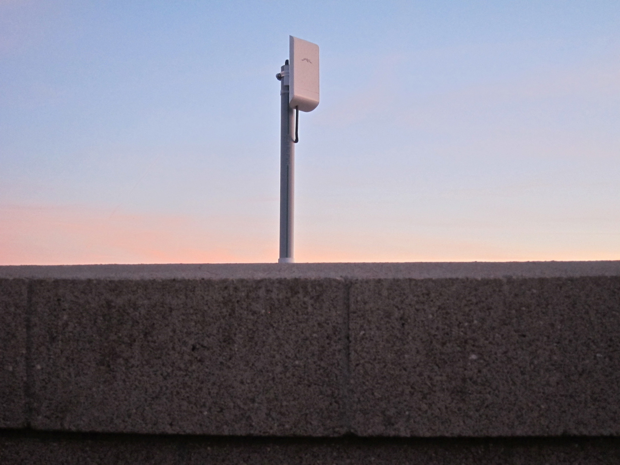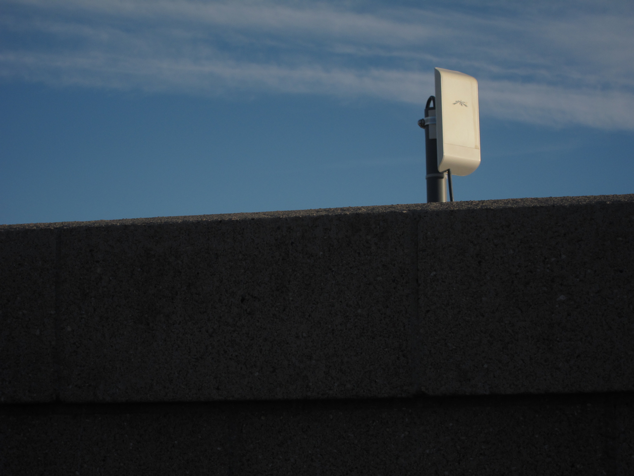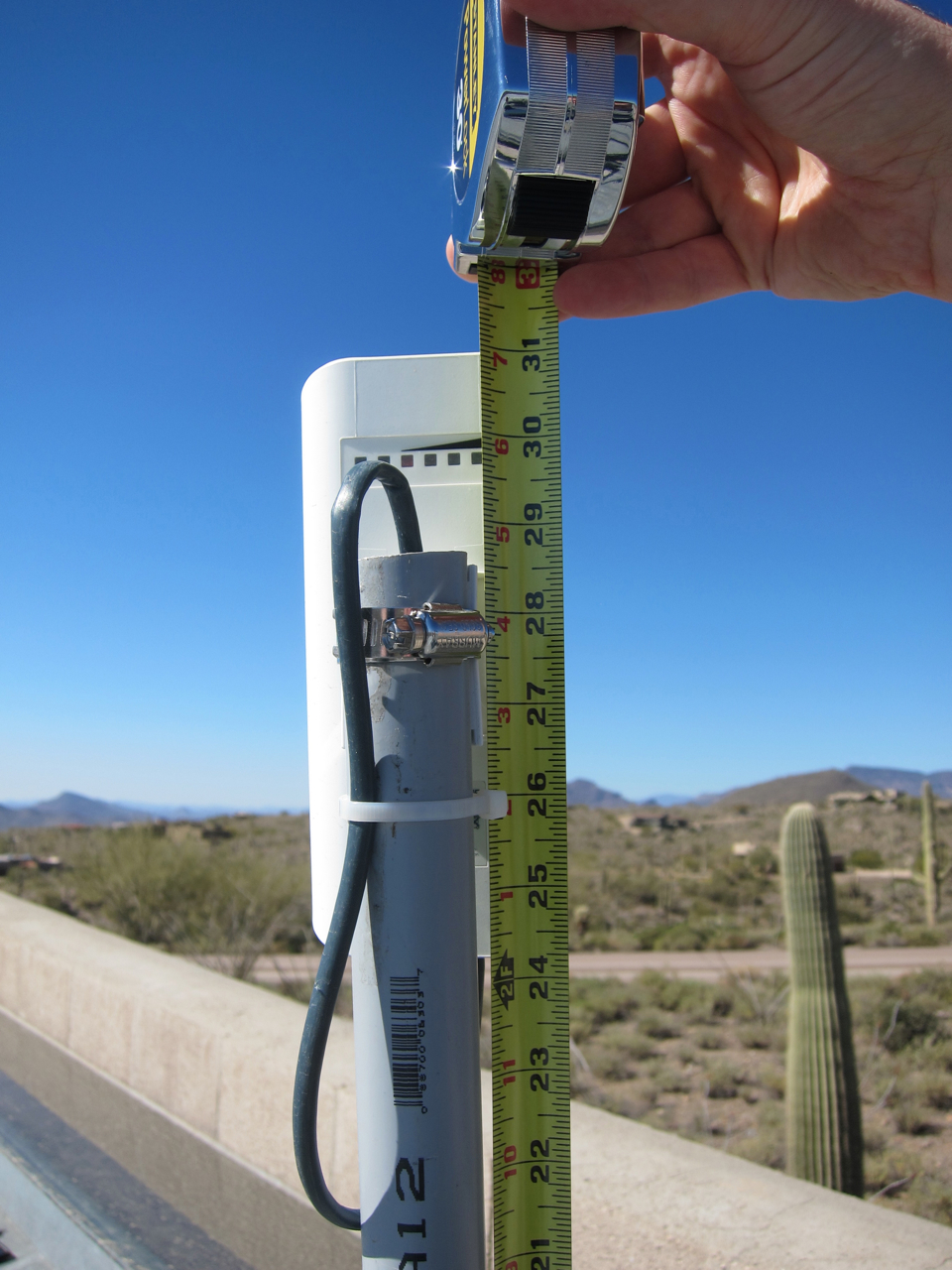 The last two photographs, (below), are of the radio taken from the roof over the Guest Bedroom, looking south, upward toward the top of largest of the CMU walls which runs the length of the house, (from east to west). The upper image was taken right after the installation was completed, while the lower image was taken after I’d replaced the PVC mast with a shorter one. The radio is barely visible from the street, since it peeks up over the CMU wall only about 12 inches or so, yet it has an unobstructed, (a.k.a. “line of sight”), view of the antenna managed by Sonoran Networks located nearby.