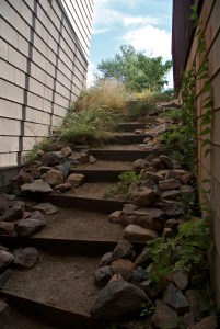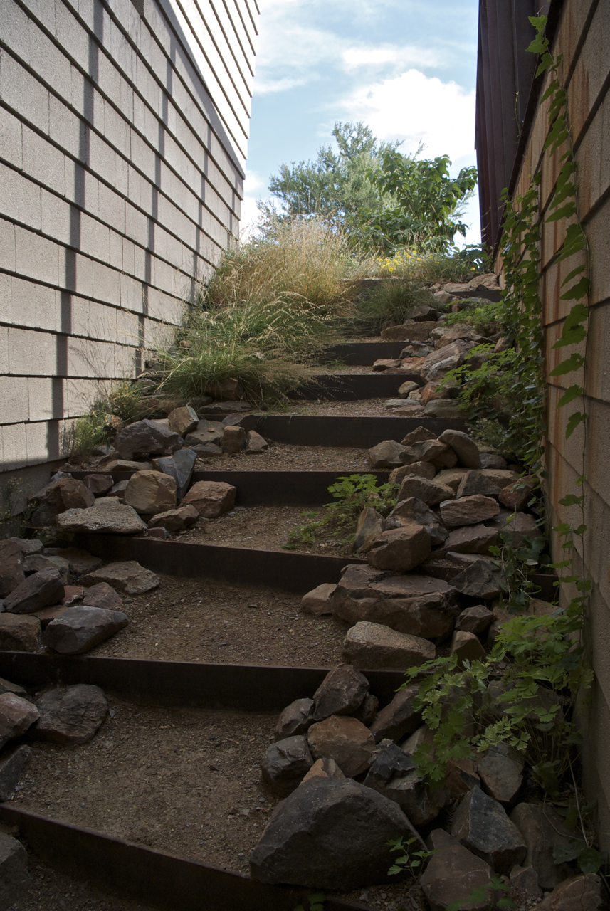 This is a relatively short post – a single image taken by Martha looking north from the ridge on our neighbor’s property toward the Byrne residence, followed by three images of the exterior stairway on the east side of the Byrne residence reflecting how well the plants have establishd themselves this past summer.