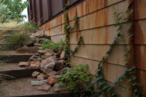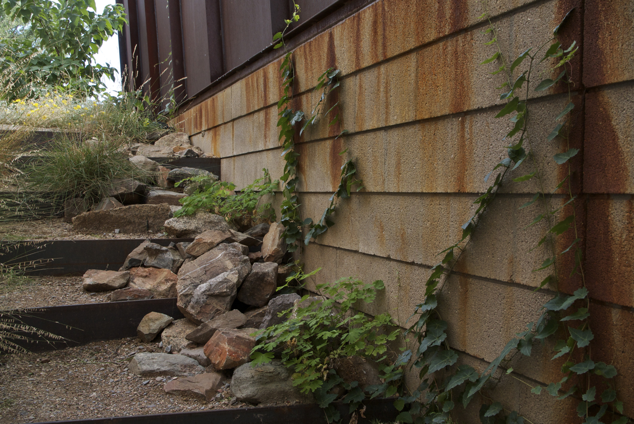 The following two images focus on the northern CMU wall and southern CMU wall respectively, enabling the reader to see how the individual plants are beginning to spill over the edges of the rocks and corten steel risers in rather interesting ways…