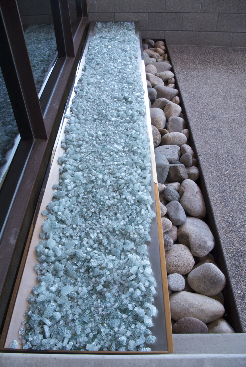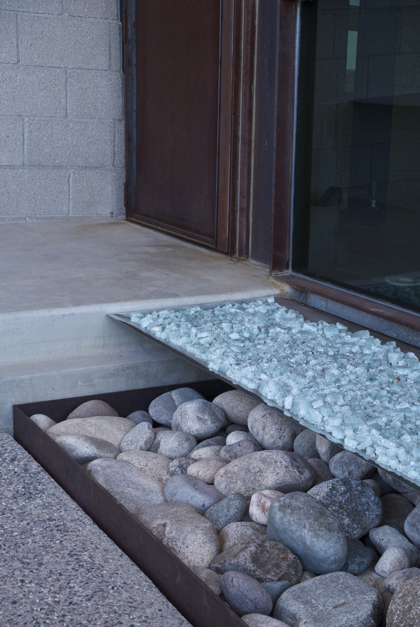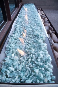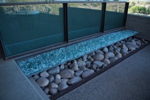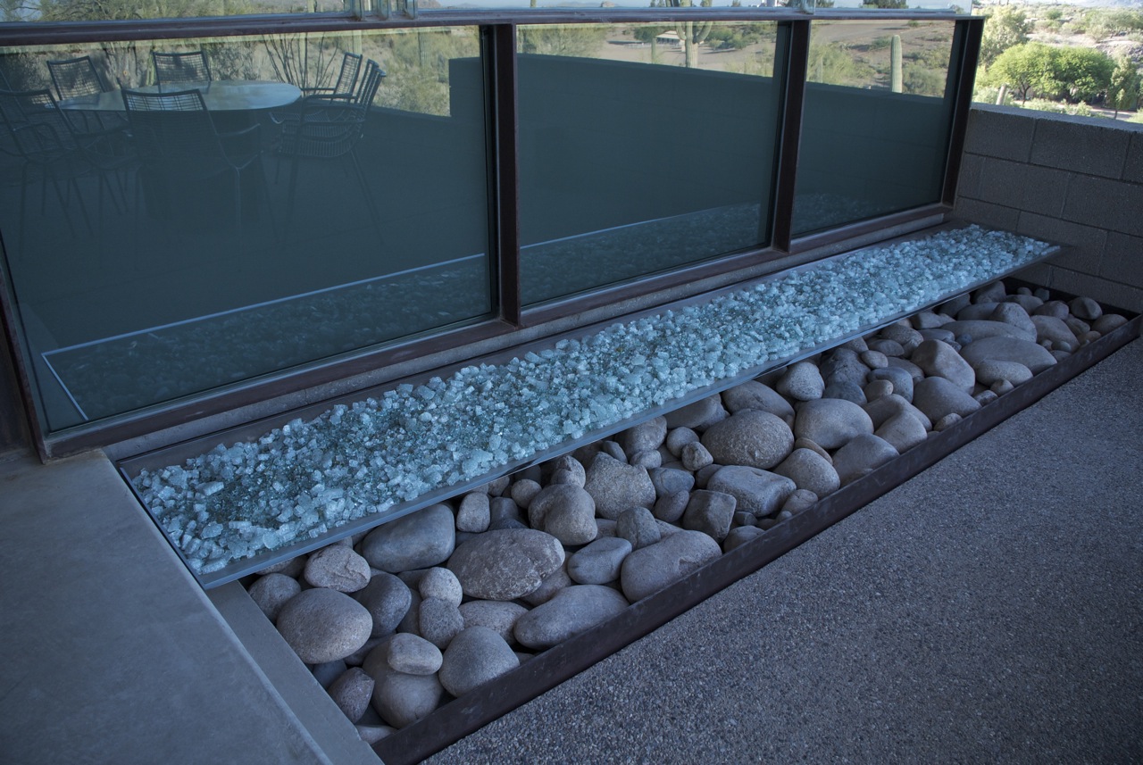 First, a more comprehensive view of the “fire & ice” feature adjacent to the west-facing wall of glass in the Living Room, captured in the following four images. Substituting the smooth-faced river rock for the sharp-edged “rip rap” in the corten steel-lined bed beneath the stainless steel tray cradling the broken glass ember bed established a clear, but pleasing contrast between the sharp, reflective and man-made materials above, (glass and stainless steel), with the smooth, dusty and natural materials below, (the surface of the river rock, the natural oxidation of the corten steel, the exposed aggregate of the patio surface itself).
