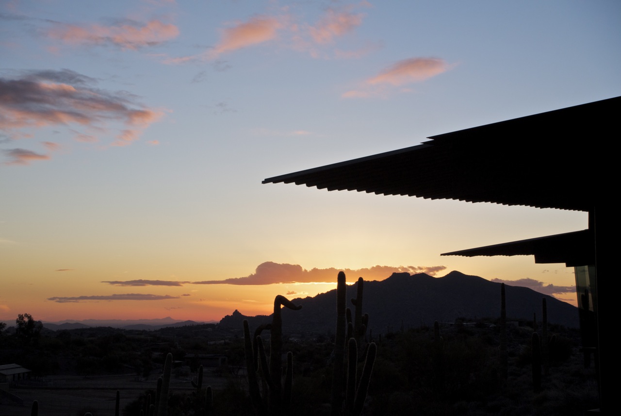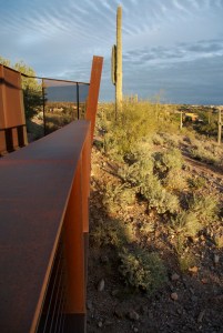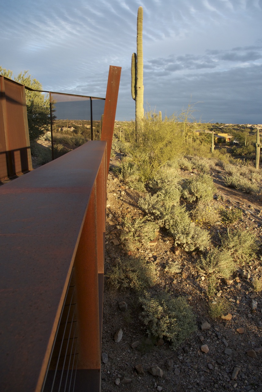 I thought I’d close this second installment of this series of posts on texture with three images taken from the east-facing deck, just off the Master Bedroom. This first image, (below), is looking east out over the deck as the sun was setting on evening while Martha was out taking photographs. Isn’t the rippling effect in the clouds interesting? The surface of the corten steel has an almost velvet-like texture in these lighting conditions, creating an interesting contrast with the varied textures of the desert immediately beyond, and below, the deck.