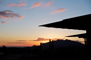 Lastly, as Martha made her way toward the eastern boundary of the deck, she turned around and captured this image, (below), looking southwest. What a fantastic sunset – an absolute riot of color! In the shadows, you see the outline of the corrugated steel roof, the silhouette of Black Mountain and the tips of several Saguaro rising from the southern slope of the property.