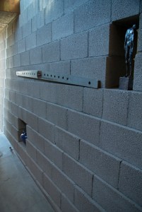 Additionally, there are three objects visible in the photograph – a lovely bronze sculpture by Gail Folwell in the foreground and an antique level I mentioned in an earlier post hangs just to the left of the sculpture. Down at the bottom of the image, you’ll catch a glimpse of a glass bowl from Cohn-Stone Studios sitting in a void toward the bottom of the CMU wall.