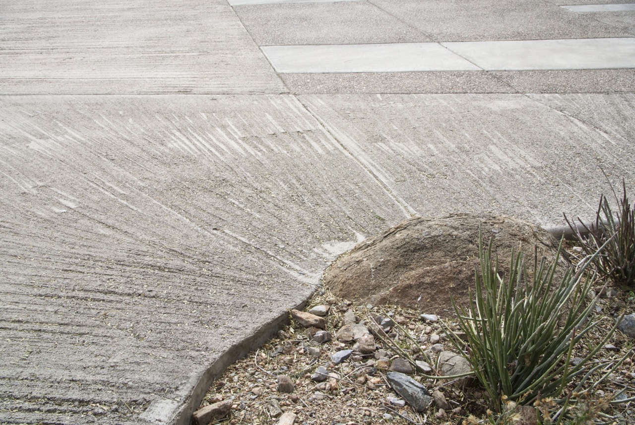 Next, a close-up of the unique pattern in the concrete on the north-west corner of the auto court in the front of the house, (below). This pattern was created by gently pressing a long piece of rebar into the curing concrete as the driveway and auto court were being poured. In fact, you can see three different surface treatments in this photograph – the highly-textured surface radiating around this curve in the foreground, the exposed aggregate surface treatment just beyond to the south, and a perfectly-smooth surface treatment just beyond that.