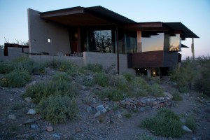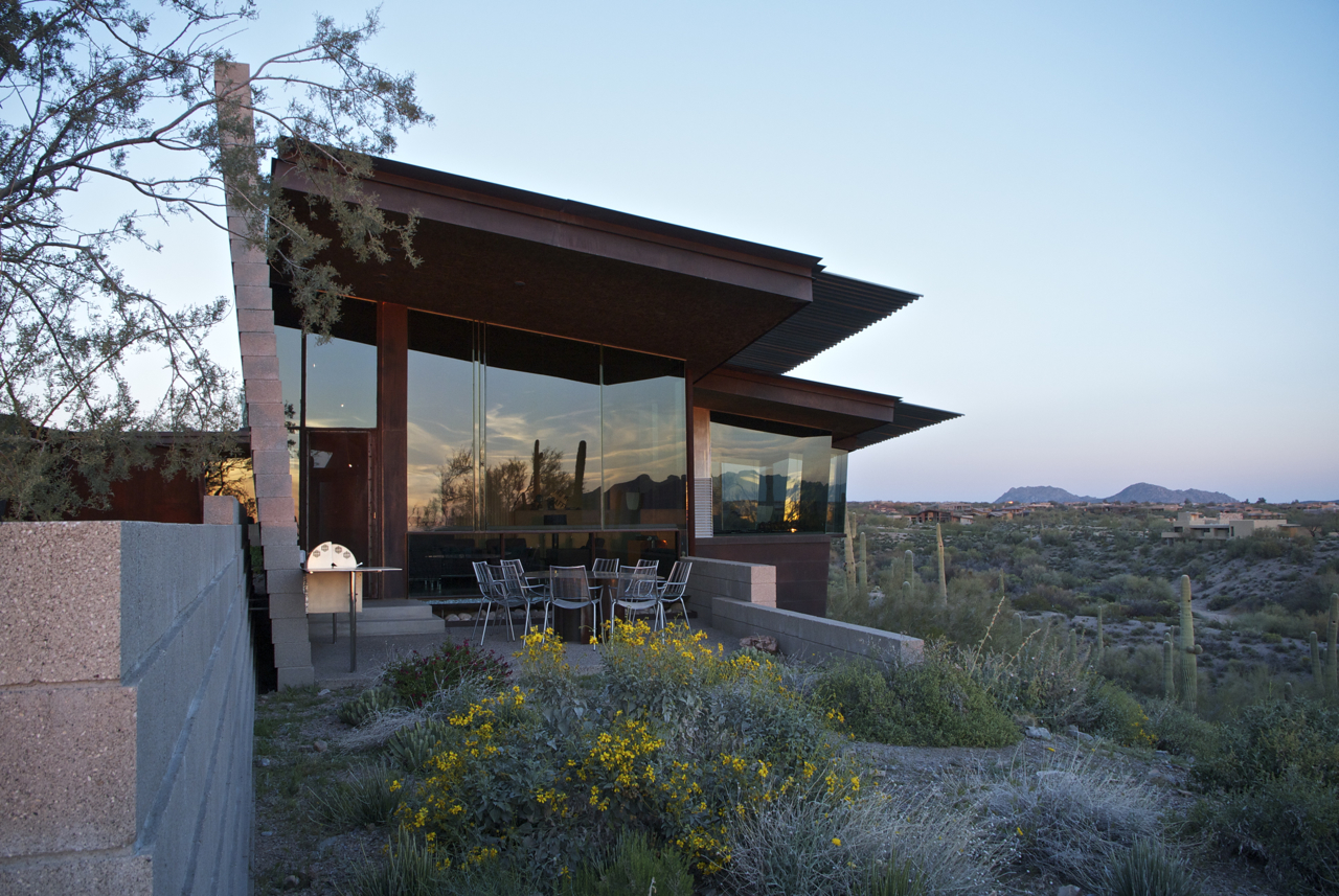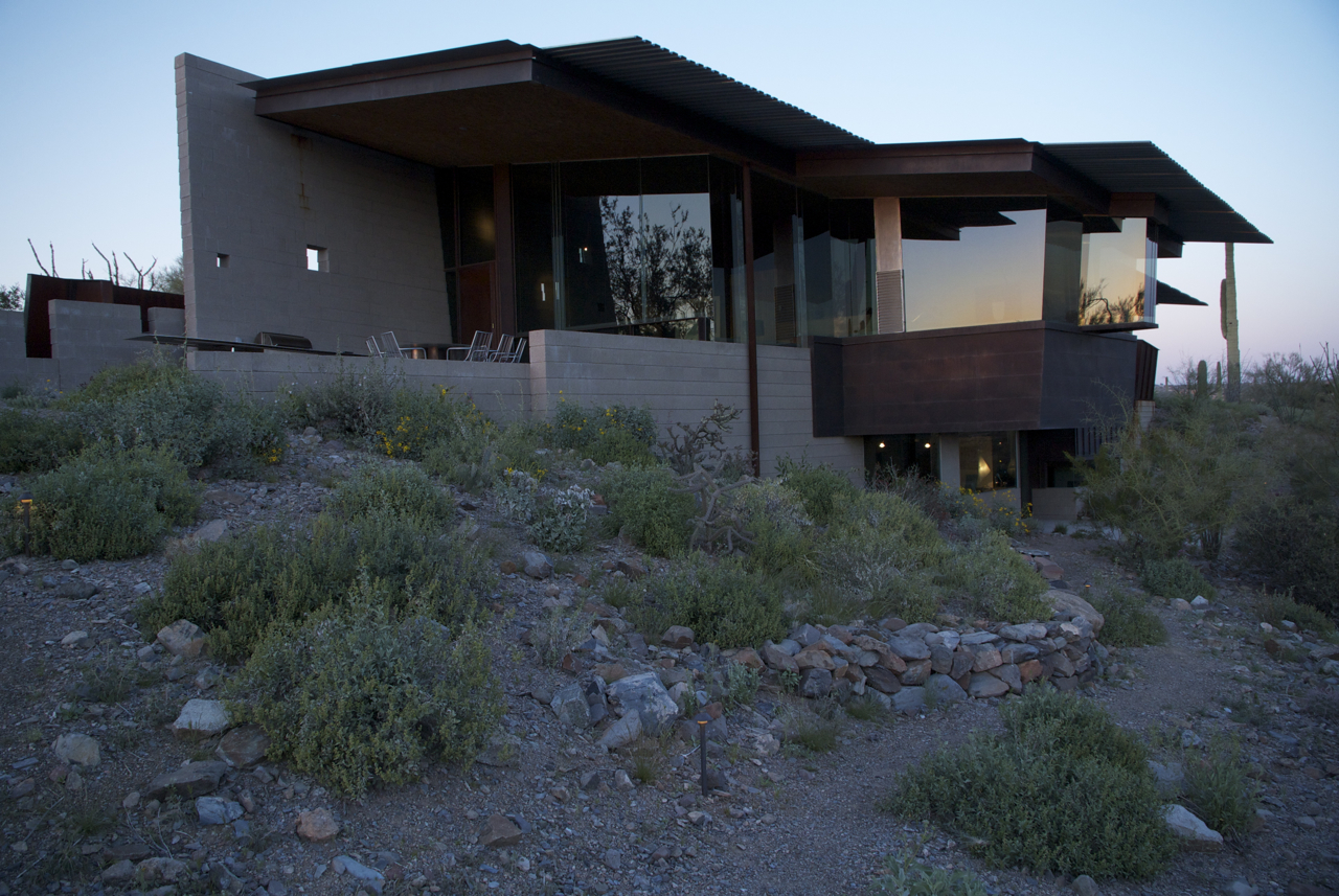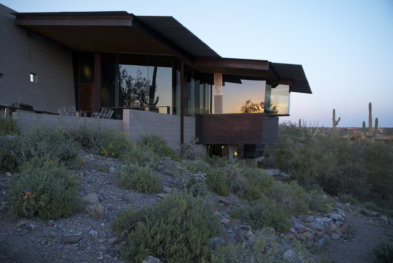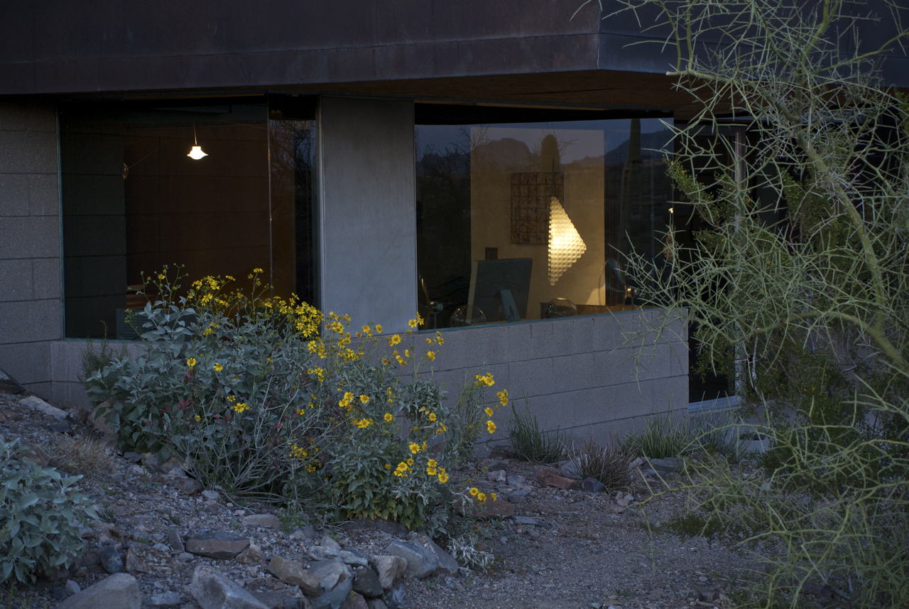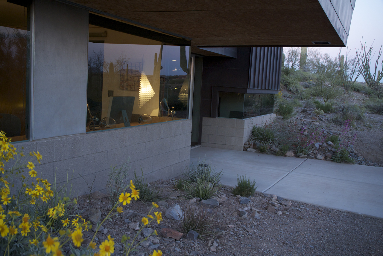 This image was taken in late March, right as the sun was setting one evening. I see so many elements worth calling out in this photograph – the Palo Verde, Ironwood and Saguaro all reflected in the windows, the color of the sky piercing the CMU wall through the void above the barbecue, the pinpoints of light inside the house on both the upper and lower levels, the warm glow of the blue-blackened copper cladding, the west-facing edges of the CMU wall, and the varied textures of the desert flora in the foreground.