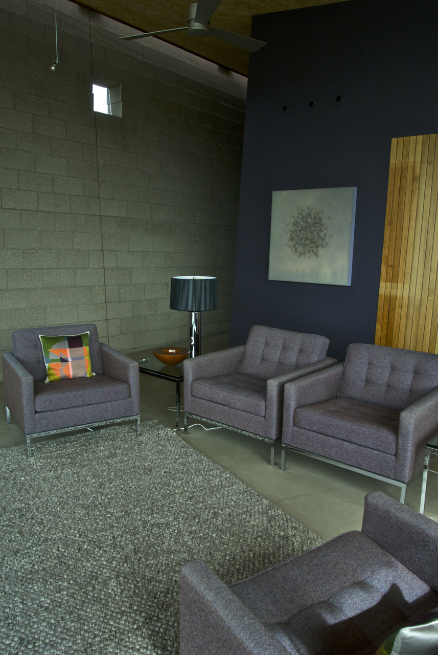 The next image, (below), is of the Living Room. The chairs are vintage Florence Knoll lounge chairs, and the side tables are Florence Knoll as well. Martha placed the rug at an angle, then re-oriented two of the Knoll chairs – isn’t the effect fantastic? Above is a mixed media panel by Mayme Kratz we’ve wanted to bring upstairs and try against the deep purple wall. It’s called “Pale Dream 2”. There are turned wood bowls by Philip Moulthrop on each of the side tables. We’re pretty sure the lamps are vintage George Kovaks dating from the 1970’s, based on a late spring visit to RED Modern Furniture.