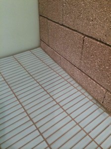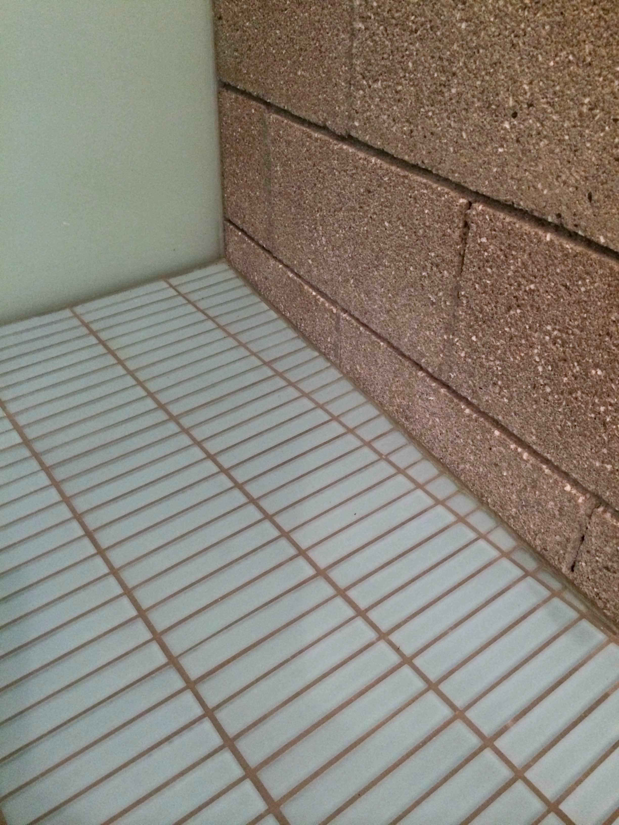 Notice the deliberate pattern of the layout – this is no happy accident – we had to make sure the shower pan surface would provide sufficient friction when wet, (i.e. the grout joint width, tile size and orientation of the pattern were deliberate choices). And the color of the grout? Yes, carefully chosen to pick up one of the hues found in the CMU wall immediately to the right.