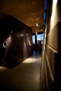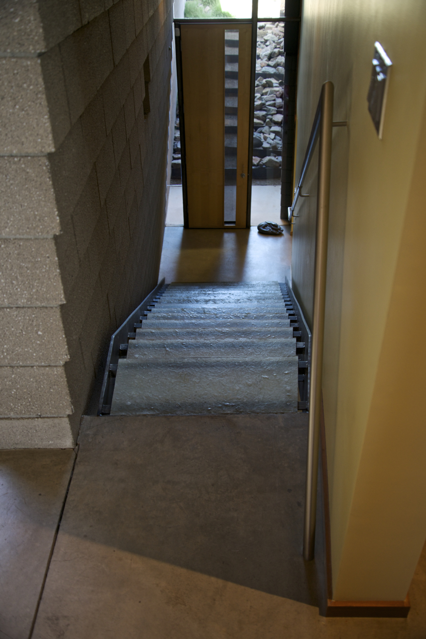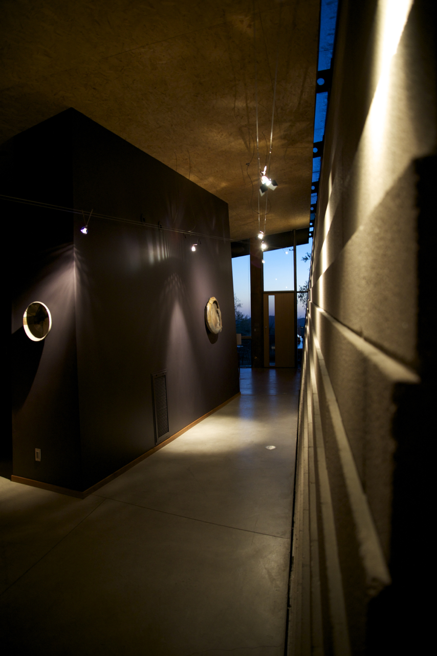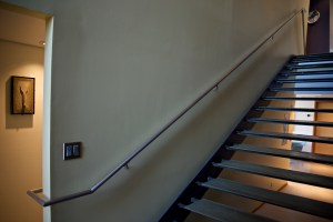 This is the second in a short series of posts describing modifications we’ve been working on with Will Bruder’s office for about six months now. Today, I’ll share several images of the new stainless steel railing leading from the Main Level to the Lower Level, a glimpse of the customized exhaust vent hood cover in the Kitchen and I’ll wrap up with an incredible image Martha captured one evening in early June of the Gallery where we’d only recently installed a new ceramic piece from Bentley Gallery by the artist Mat Rude.