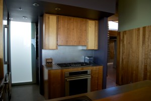 Now we’ll move back up to the Main Level and into the Kitchen where the exhaust vent hood for the gas-fired cooktop was completely re-imagined. The stainless steel backsplash was extended to cover the entire wall and it was Will who suggested we consider an expertly-crafted panel of solid cherry which would be trimmed with stainless steel polished to a mirror finish on the very edge. This remarkable detail ties directly to design elements dating back 15 years – the use of stainless steel with both non-directional surfaces and polished mirror finish edges, (matching the countertops). Note how the grain of the cherry panel has been deliberately oriented so it looks like waves of water pouring into pots simmering on the cooktop below – when Will described this subtle, but carefully-considered detail, we both just stood there and marveled. The exhaust vent hood itself is hinged – if you gently pull the bottom edge out, the fan starts automatically and the angled front edge forms the perfect funnel to capture both the heat and cooking vapors coming up off the cooktop and whisks them though the duct to the roof. Additionally, there are two ideally-placed halogen lamps toward the back of the exhaust vent enclosure that illuminate the cooking surface perfectly – entirely functional and yet remarkably beautiful!