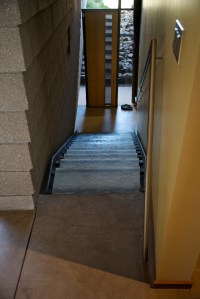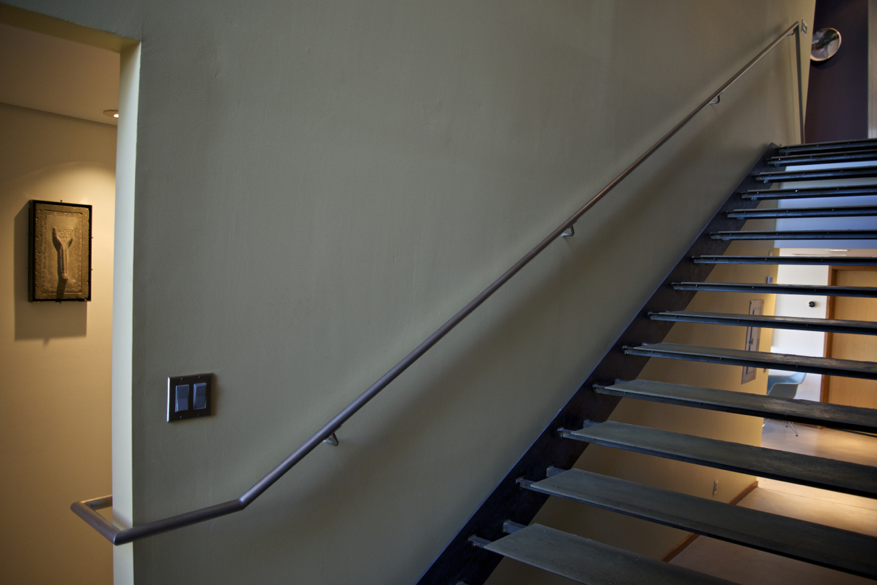This second image, (below), was taken from the landing at the bottom of the stairs – while the original railing ended at the bottom of the stairs, this creative twist, (literally), has the railing wrapping around the corner and continuing down the two steps on the other side leading to the Lower Level. Recall this wall is set at a slight angle, yet the railing is perfectly level and the distance from the wall to the inside edge of the stainless steel tubing is consistent from the very first stair to the very last step on the opposite side of the wall, some 30+ linear feet away!