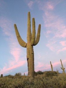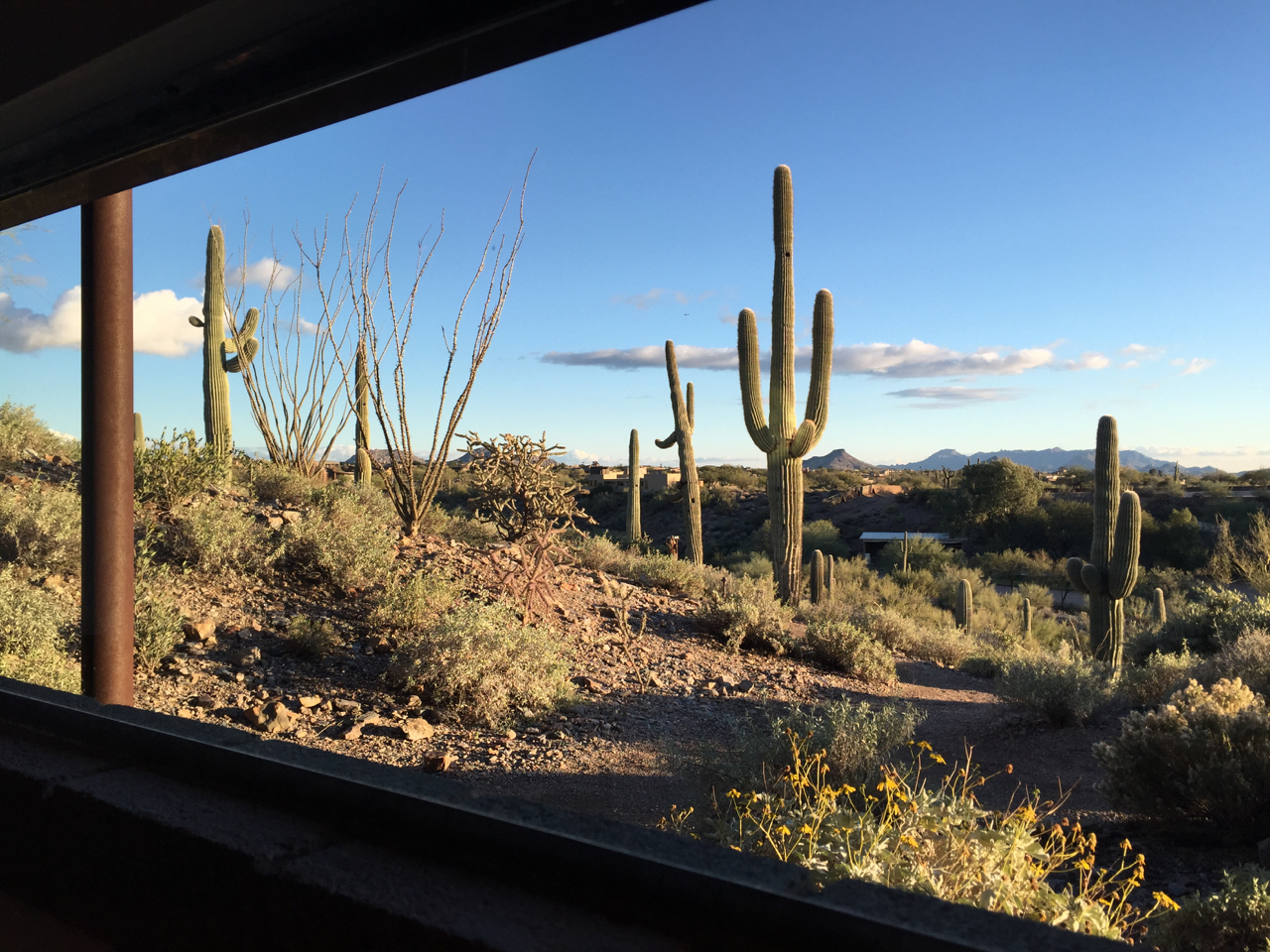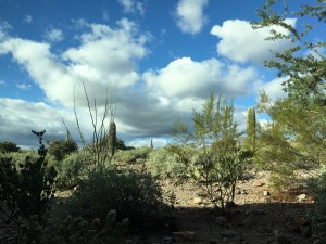 This next image, (below), was taken from the Laundry on the Lower Level, looking southeast. Enormous Saguaro cactus loom in the foreground, with striking cloud formations set against a brilliant blue sky in the background.