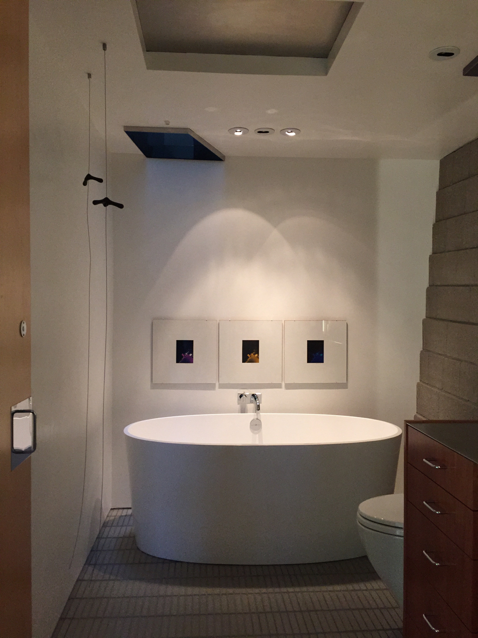 In this first image, (below), you see the three variants of a photograph taken by Will Bruder at the Kunsthaus Bregenz, designed by Peter Zumthor hung immediately above the tub. He was there in 1997 for the James Turrell opening, and captured these three images by dangling his camera over the edge of the building while up on the roof! They are sequenced red, yellow, blue from left to right – we’ll leave it to the viewer to tease out the meaning behind this particular ordering of the images…