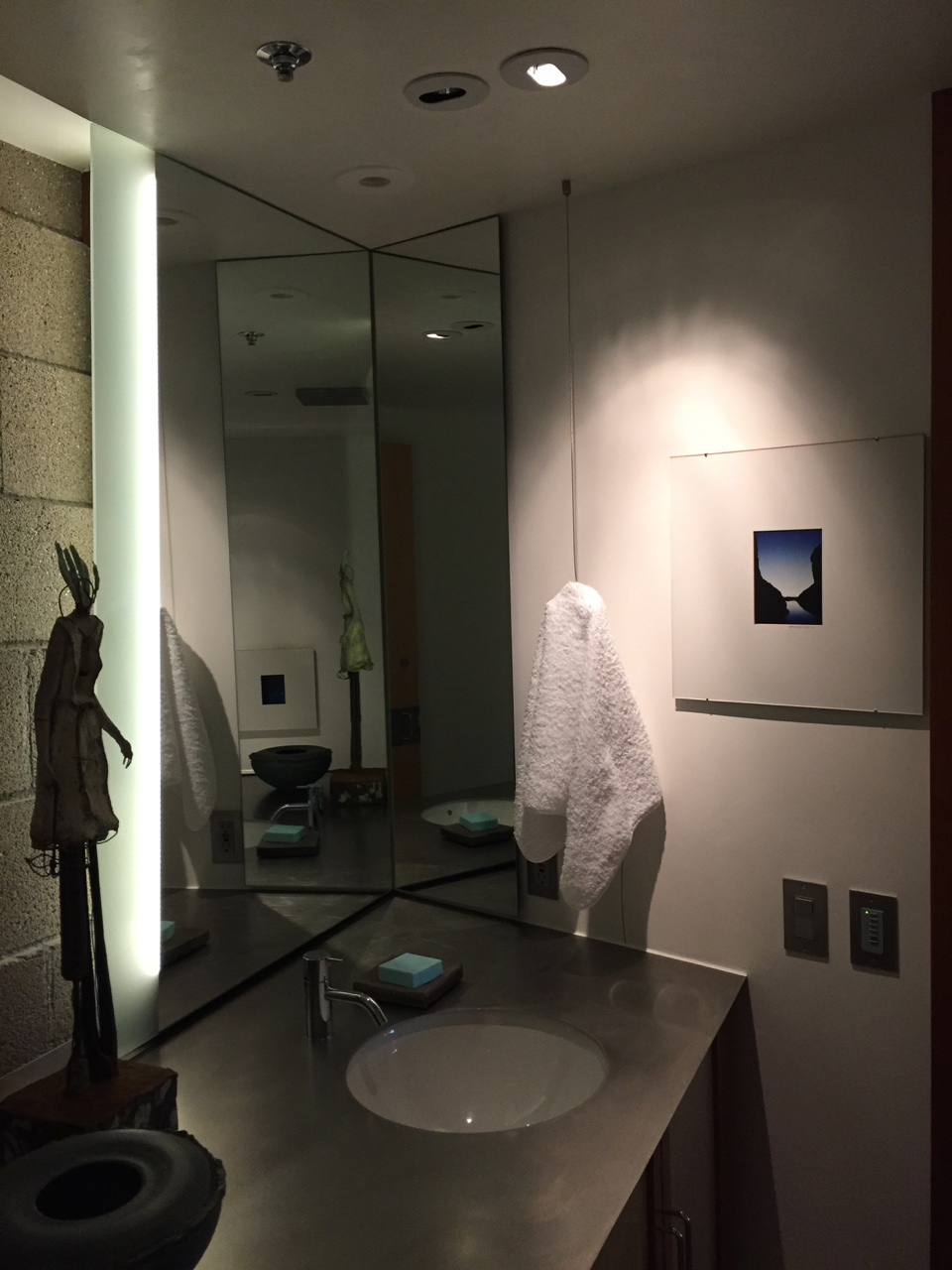 This next image, (below), is of the fourth Will Bruder photograph now hanging in the Guest Bathroom. It’s of the Rio Grande at sunrise, taken near Marfa, TX. The notion of a canyon, the cool blue hue in the sky, the glassy surface of the water – a perfect complement to the three-dimensional pieces sitting on the counter, don’t you think?