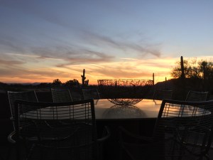 …and at sunset, we see brilliant oranges as the sun dips below Black Mountain to the west. Appearing to float in the foreground, (almost hidden in the shadows), the cast acrylic tabletop supports a delicate wire basket, which, in turn, is bracketed by several Emu outdoor chairs, thus creating additional visual interest.
