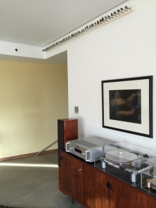 This third image, (below), captures the whimsical placement of a series of 44 leaves cast in bronze by the artist J. Hill, currently living and producing art in Houston, TX. While Will Bruder and Louise Roman were at the house in early December, we enlisted their help with the placement of this piece as well – we are thrilled with the result, (above, and to the left of a remarkable nude by the photographer John Casado)! The individual bronze leaves are attached to a narrow piece of beveled trim – Will recommended we center the leaves on the adjacent HVAC outlet and bring the piece out from the corner the same distance as the width of the beveled trim – brilliance!