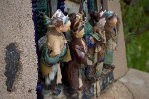 Martha captured this next image as we were making our way between buildings. I was struck by the vividness of the blue and turquoise glazes, despite the fact these panels are older than I am! These ceramic panels are embedded into exterior walls in multiple locations – I wonder what these particular four figures are peering at? 😉