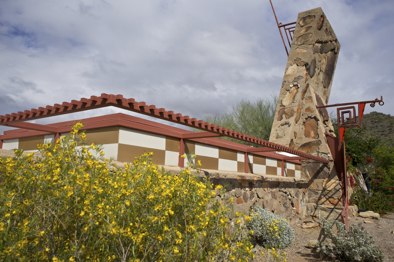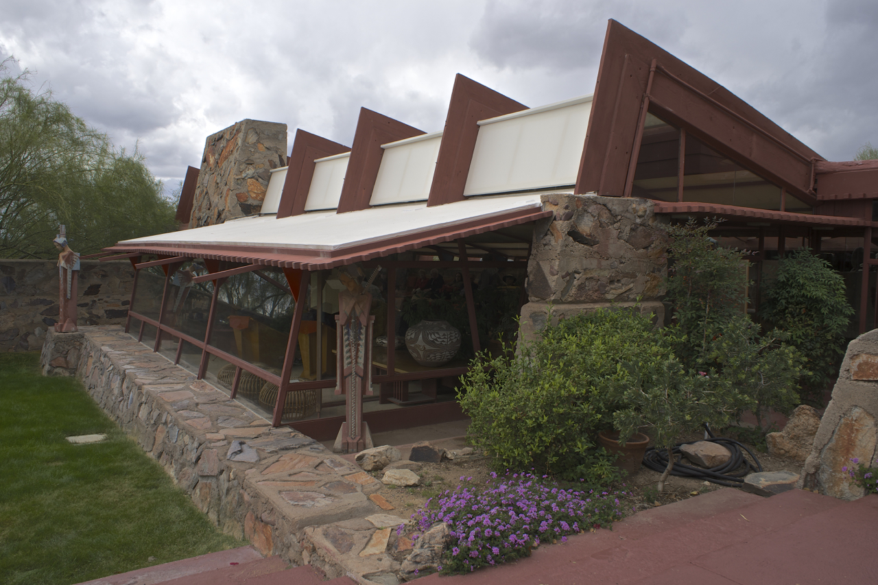 A week ago this past Monday, Martha and I had the privilege of visiting Taliesin West and meeting with Dottie O’Carroll, Vice President of Development and Communications for the Frank Lloyd Wright Foundation and Fred Prozzillo, Director of Preservation at Taliesin West, for a private tour. Our tour was followed by a lively discussion over a delicious lunch focused largely, but not exclusively, on the topic of preservation. We concluded our visit by enjoying an expertly-crafted latte served from a relatively new addition to the property, Royal Coffee Bar, (more on this later in the post), before scooping up a handful of DVDs from the bookstore/gift shop and heading back to the Byrne residence to enjoy a spectacular sunset!