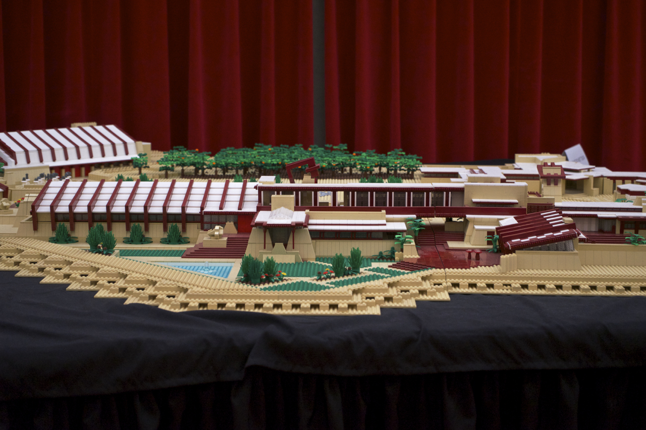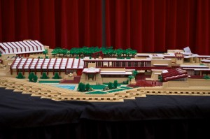 Fred shared this wonderful model, (captured in Martha’s photograph below), of what’s referred to as the “historic core” of Taliesin West – basically the group of buildings that were constructed during the two decade long period between 1938 and 1959. This model is composed entirely of Lego bricks, and measures some eight feet down either side – it’s huge! The model splits into five pieces so it can be shipped, and it will eventually go on tour, but for the time being, the model is located in a building referred to as the Music Pavilion, the last of three performance spaces constructed at Taliesin West, and one of our last stops on the tour that day.