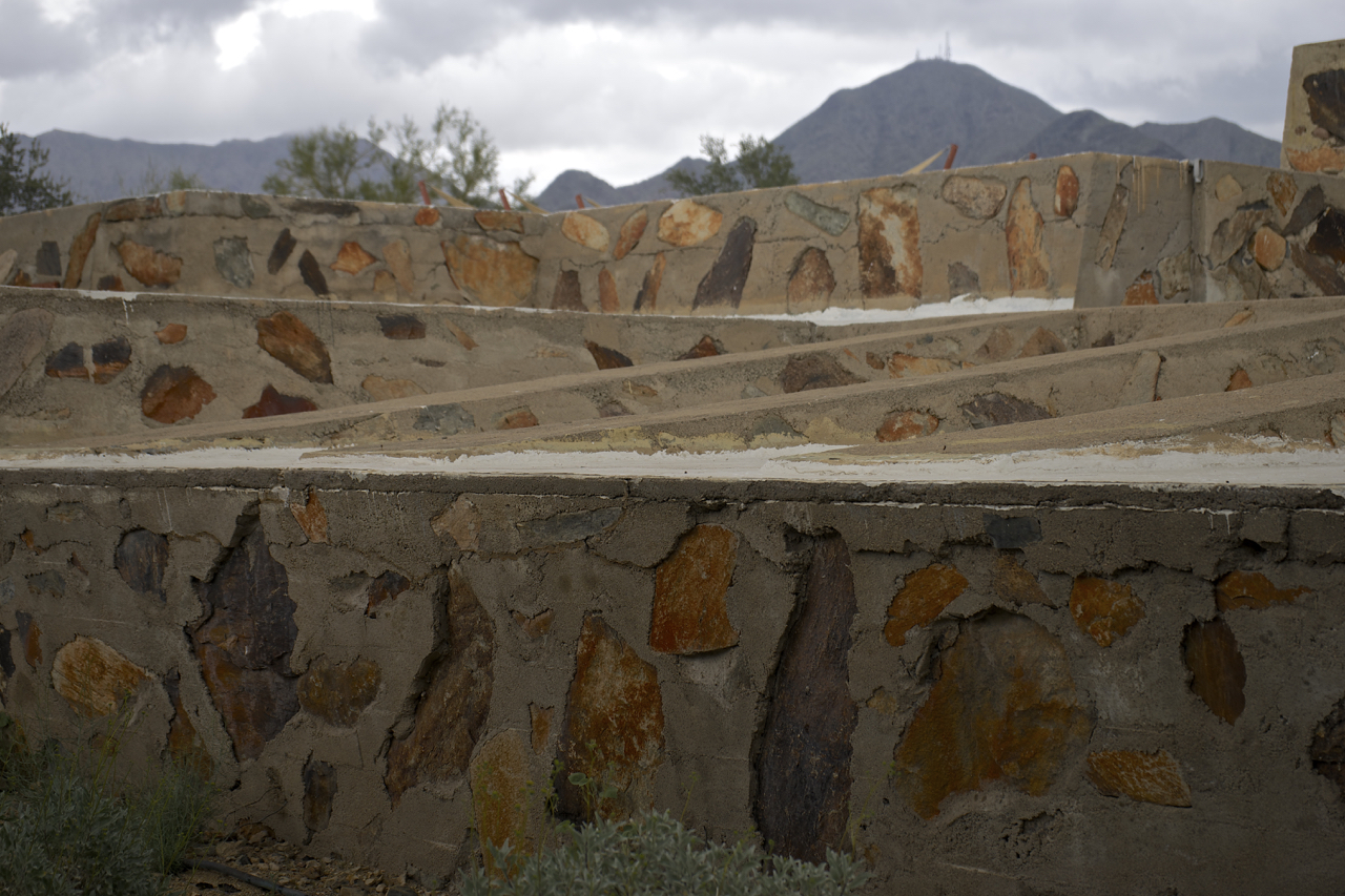 This next image is of the exterior of the Wright’s personal quarters. One of the DVDs we watched several evenings later described the style of these massive concrete walls as “desert rubble masonry” construction. While the appearance might be viewed as random, we learned every single wall was deliberately laid out, stone by stone.