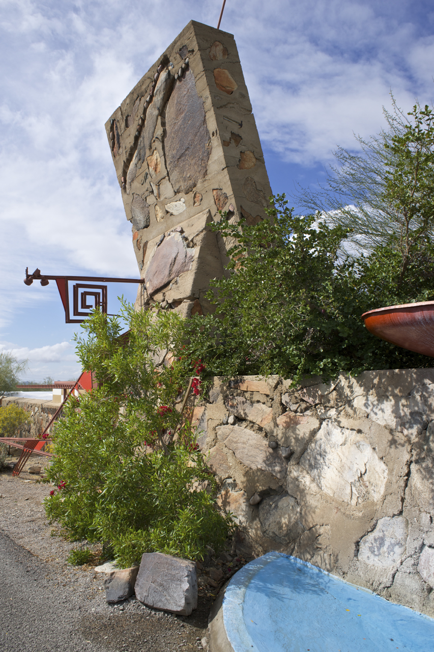 Fred began our tour near the entrance to Taliesin West, which is graced by a two-story gate-like sculpture containing a hammer slipped into the concrete form as a prank. As Fred explained, one apprentice had been boasting about the quality of their new tools, so the other apprentices decided one of those tools – the hammer you see in the photograph – should become a permanent part of the structure. The story goes that FLLW saw the hammer and decreed it remain in place, so it did!