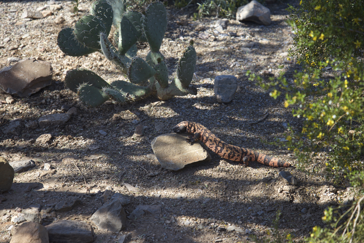 We were thrilled to find a Gila Monster prowling around the property on March 24th looking for Gambel’s Quail nests – or more specifically for the tasty unhatched eggs inside those nests!