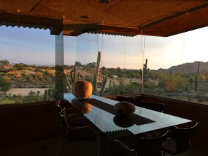 This next image was taken as the sun was setting a little over a week ago. The sandblasted texture of the OSB panels on the ceiling is fully illuminated for just a few minutes each evening at this time of year. The texture of the OSB reminds us of suede. Notice the fantastic glow on the Gloria Graham ceramic vessel in the background contrasted against the velvety surface of the Robert J. Medford ceramic vessel in the foreground.