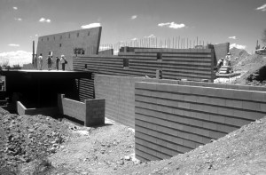 The thought that runs through my head every time I look at this photograph is “How on earth did these extremely capable masons manage to erect every single CMU wall so precisely?” Bill said the solution was based on three absolute reference points established on the building site – all measurements were taken against these absolute reference points for the duration of the construction project. In fact, all three of these reference points can still be spotted out in the desert – they’re short lengths of rebar, embedded in concrete and sprayed yellow!