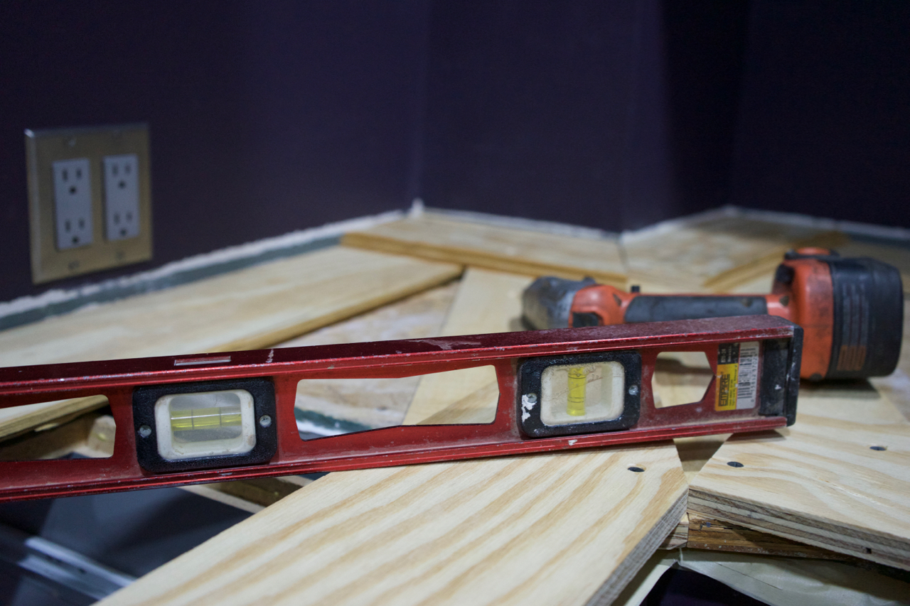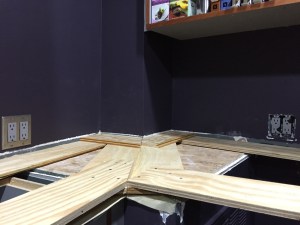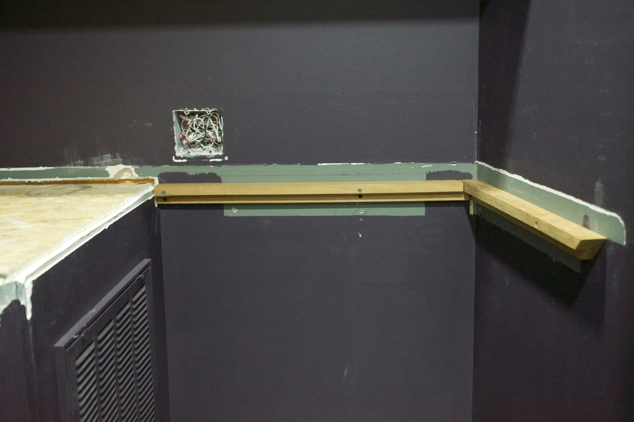 This first image, (below), is of the new cleats positioned after the old countertops and cleats had been removed. Notice the exposed OSB on the left-hand side of the image, and the contrast created by the original color of the Pantry and the current color, cleverly re-appropriated from elsewhere in the house by Martha in 2011 when we re-painted.