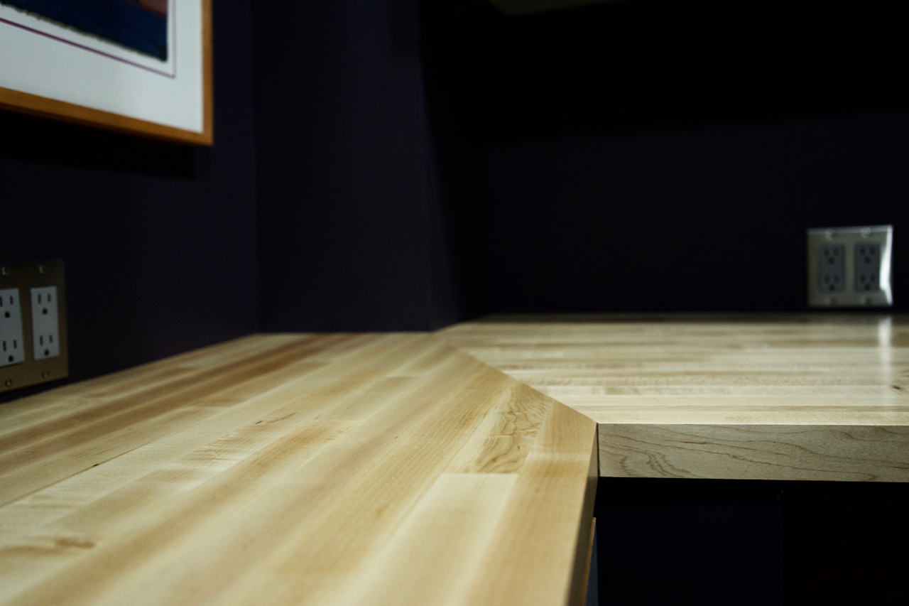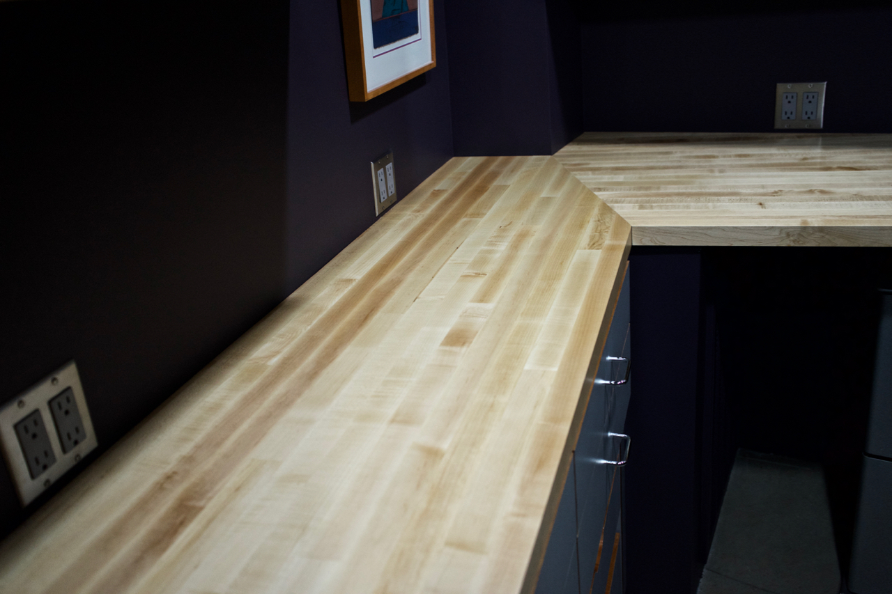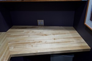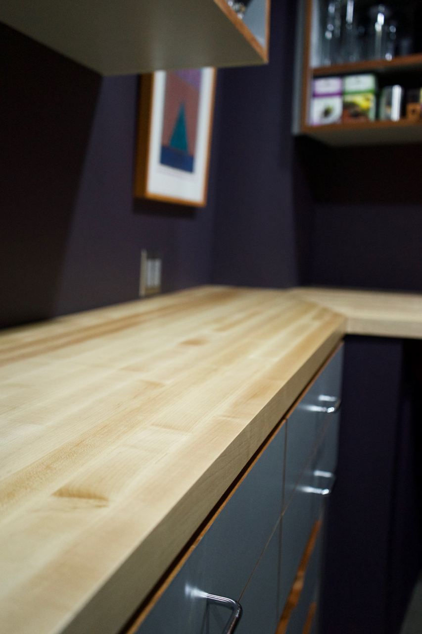 This image, (below), emphasizes the linear pattern in the maple butcher block – fantastic! Believe it or not, every wall seam is so tight you cannot slide a single sheet of typing paper into the void between the wall and the countertop – now that’s craftsmanship!