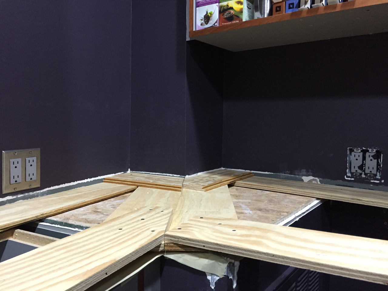 This next image, (below), captures several of the challenges Todd faced as he was gingerly extracting the old countertops and assembling the templates he would use to scribe the two handsome maple butcher block panels waiting in the garage. Will Bruder wanted the seam between the two panels anchored to the column in the corner of the Pantry, traverse the diagonal and terminate above the enclosure supporting the countertop. Todd had to install a 1/4 inch thick piece of plywood above the drawers to bring the surface level to the OSB visible beneath the two templates. …and yes, there was plenty of drywall repairing to be done as well!